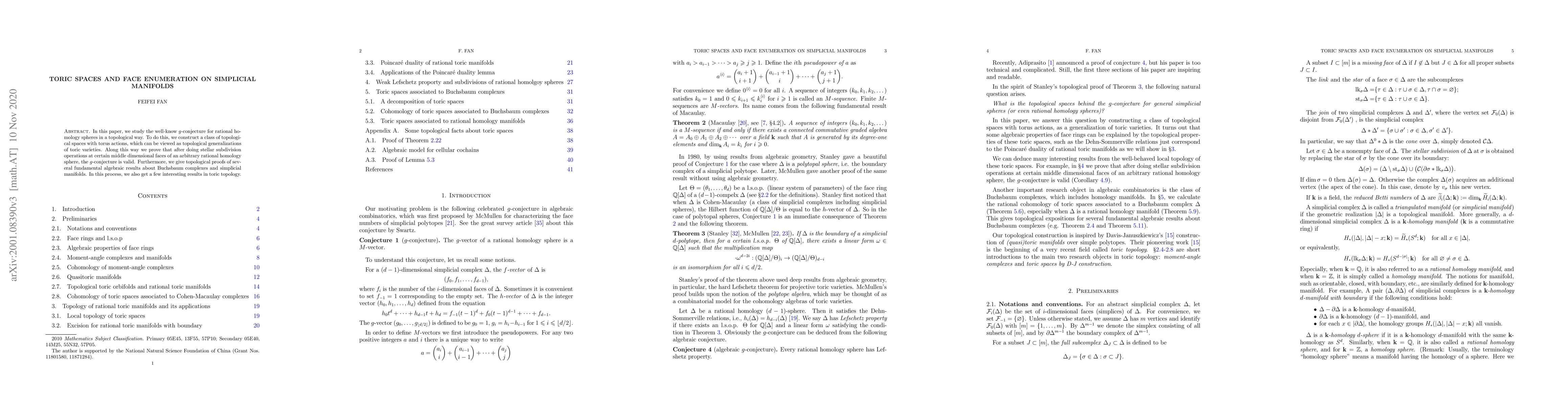 In this paper, we study the well-know $g$-conjecture for rational homology spheres in a topological way. To do this, we construct a class of topological spaces with torus actions, which can be viewed as topological generalizations of toric varieties. Along this way we prove that after doing stellar subdivision operations at some middle dimensional faces of an arbitrary rational homology sphere, the $g$-conjecture is valid. Furthermore, we give topological proofs of several fundamental algebraic results about Buchsbaum complexes and simplicial manifolds. In this process, we also get a few interesting results in toric topology.