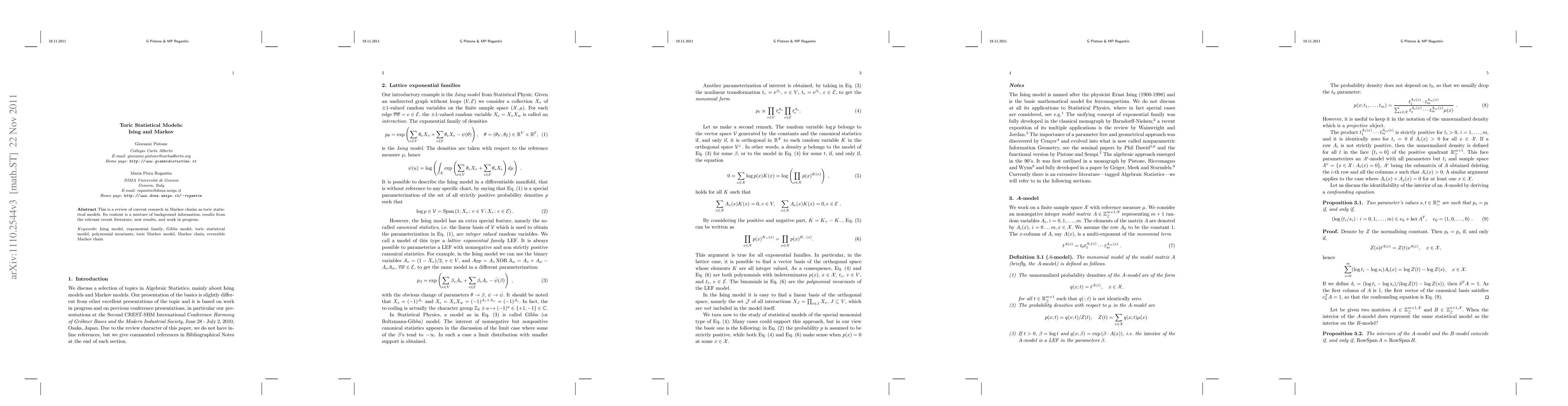 This is a review of current research in Markov chains as toric statistical models. Its content is mixture of background information, results from the relevant recent literature, new results, and work in progress.
