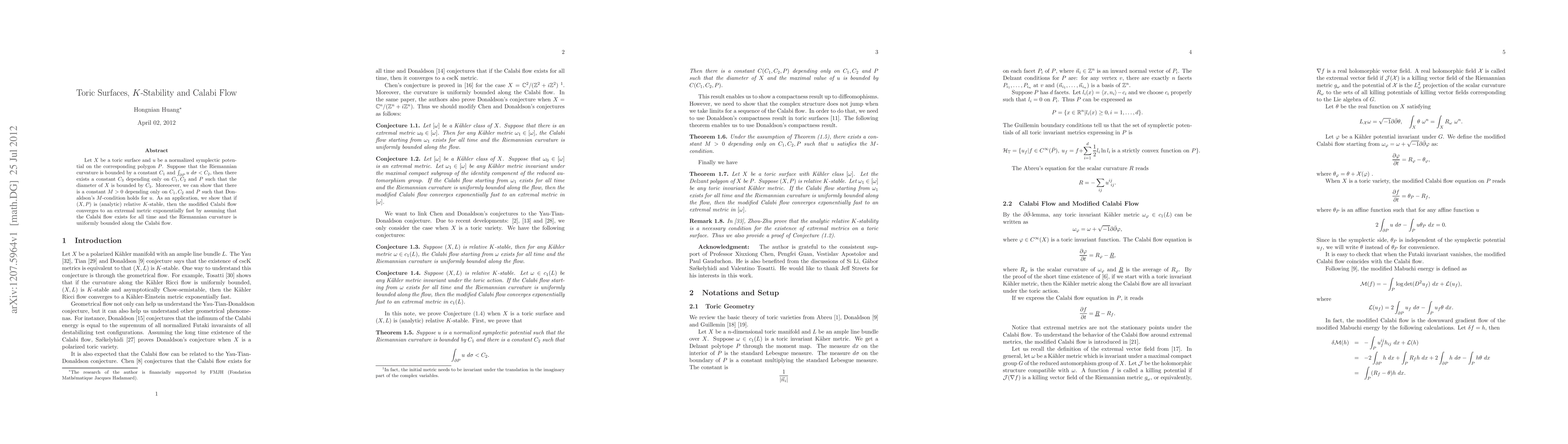 Let $X$ be a toric surface and $u$ be a normalized symplectic potential on the corresponding polygon $P$. Suppose that the Riemannian curvature is bounded by a constant $C_1$ and $\int_{\partial P} u ~ d \sigma < C_2, $ then there exists a constant $C_3$ depending only on $C_1, C_2$ and $P$ such that the diameter of $X$ is bounded by $C_3$. Moreoever, we can show that there is a constant $M > 0$ depending only on $C_1, C_2$ and $P$ such that Donaldson's $M$-condition holds for $u$. As an application, we show that if $(X,P)$ is (analytic) relative $K$-stable, then the modified Calabi flow converges to an extremal metric exponentially fast by assuming that the Calabi flow exists for all time and the Riemannian curvature is uniformly bounded along the Calabi flow.