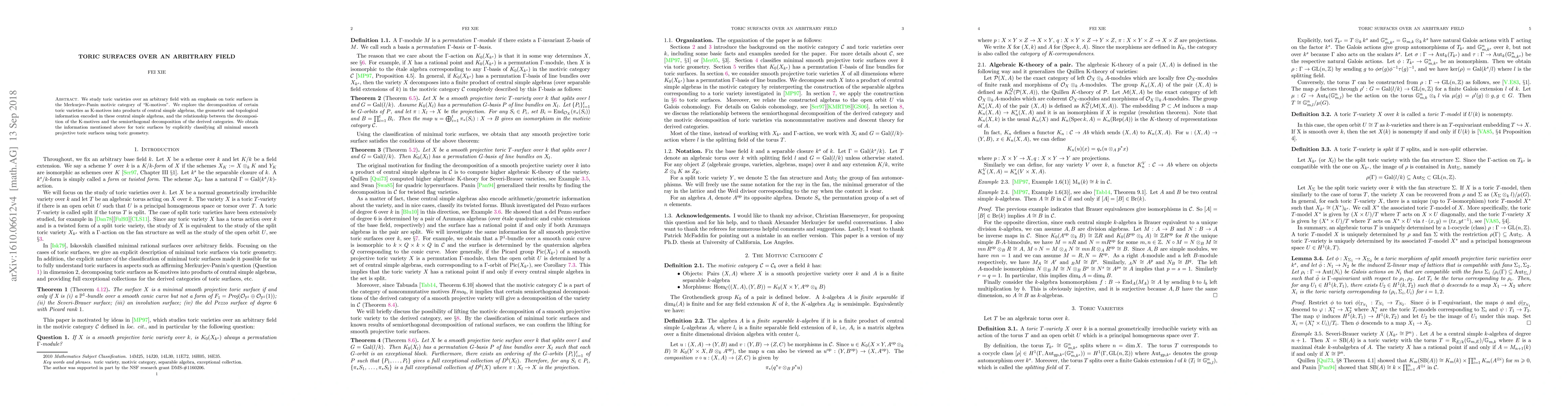 We study toric varieties over an arbitrary field with an emphasis on toric surfaces in the Merkurjev-Panin motivic category of "K-motives". We explore the decomposition of certain toric varieties as K-motives into products of central simple algebras, the geometric and topological information encoded in these central simple algebras, and the relationship between the decomposition of the K-motives and the semiorthogonal decomposition of the derived categories. We obtain the information mentioned above for toric surfaces by explicitly classifying all minimal smooth projective toric surfaces using toric geometry.