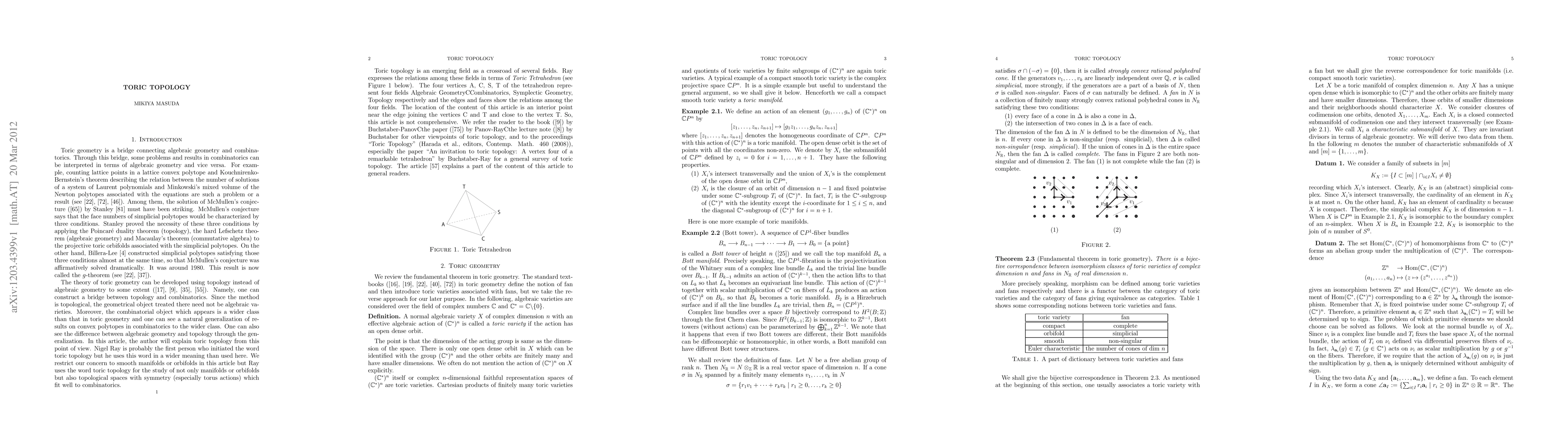 Toric topology explores the interplay between algebraic topology and combinatorial commutative algebra, focusing on the study of toric varieties and their topological properties. This survey highlights key results and advances in the field, emphasizing the connections between these mathematical domains.