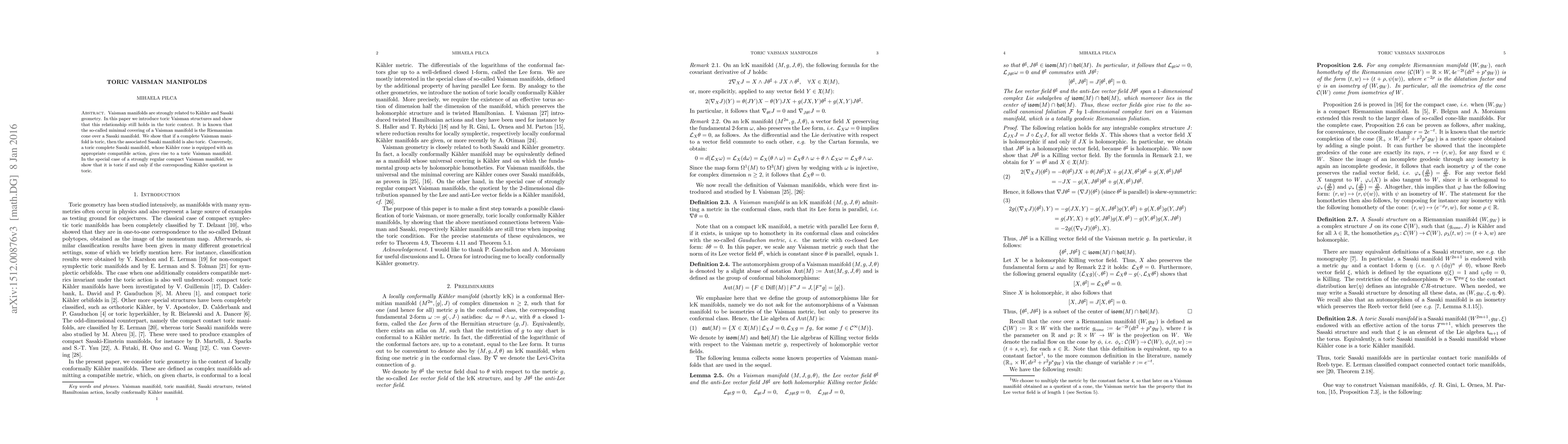 This paper introduces toric Vaisman structures, demonstrating their connection to Kähler and Sasaki geometry within a toric context. It shows that toric complete Vaisman manifolds correspond to toric Sasaki manifolds, and vice versa, under appropriate conditions.