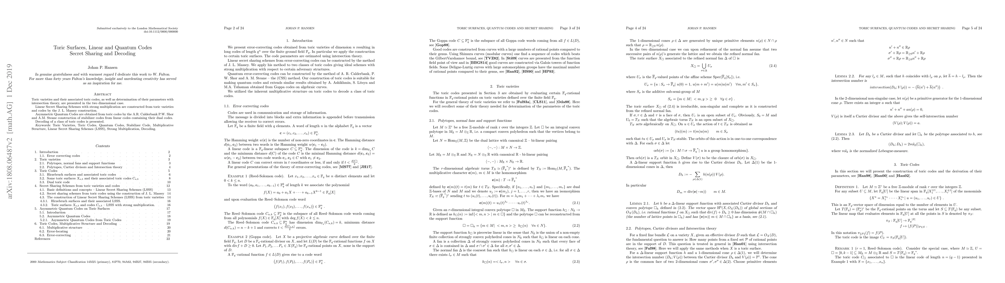 Toric varieties and their associated toric codes, as well as determination of their parameters with intersection theory, are presented in the two dimensional case. Linear Secret Sharing Schemes with strong multiplication are constructed from toric varieties and codes by the J. L. Massey construction. Asymmetric Quantum Codes are obtained from toric codes by the A.R. Calderbank, P.W. Shor and A.M. Steane construction of stabilizer codes from linear codes containing their dual codes. Decoding of a class of toric codes is presented.