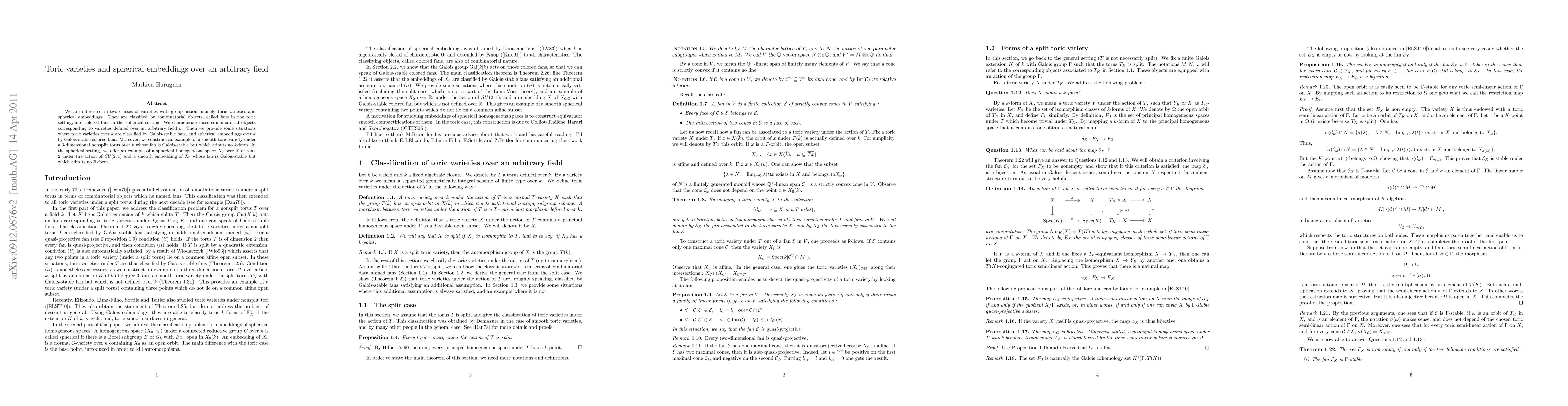 This paper classifies toric varieties and spherical embeddings over an arbitrary field $k$ using combinatorial objects called fans and colored fans, respectively. It provides examples where these varieties are characterized by Galois-stable objects but lack corresponding $k$-forms.
