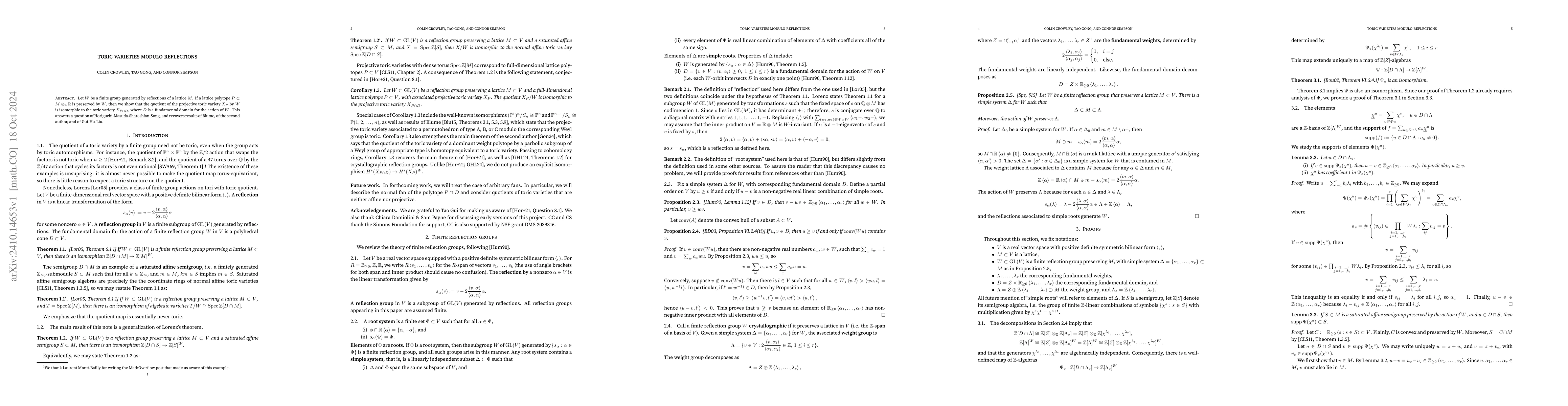 The paper demonstrates that the quotient of a projective toric variety by a finite reflection group $W$ is isomorphic to a toric variety associated with a polytope in a fundamental domain for $W$, answering a question posed by Horiguchi-Masuda-Shareshian-Song and unifying prior results from several researchers.