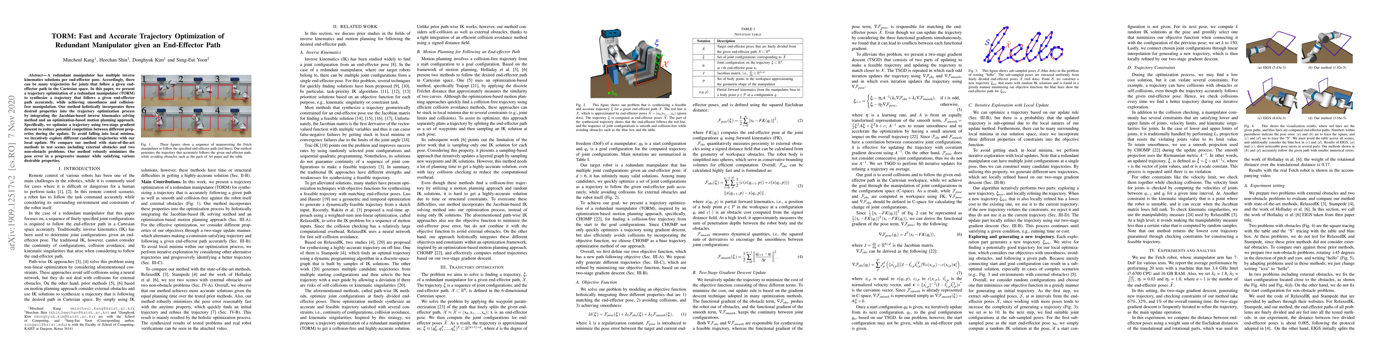 This paper presents TORM, a method for optimizing the trajectory of redundant manipulators to accurately follow a given end-effector path while ensuring smoothness and collision-free manipulation. The approach integrates Jacobian-based inverse kinematics and optimization-based motion planning, employing two-stage gradient descent and iterative exploration to avoid local minima and achieve robust performance.