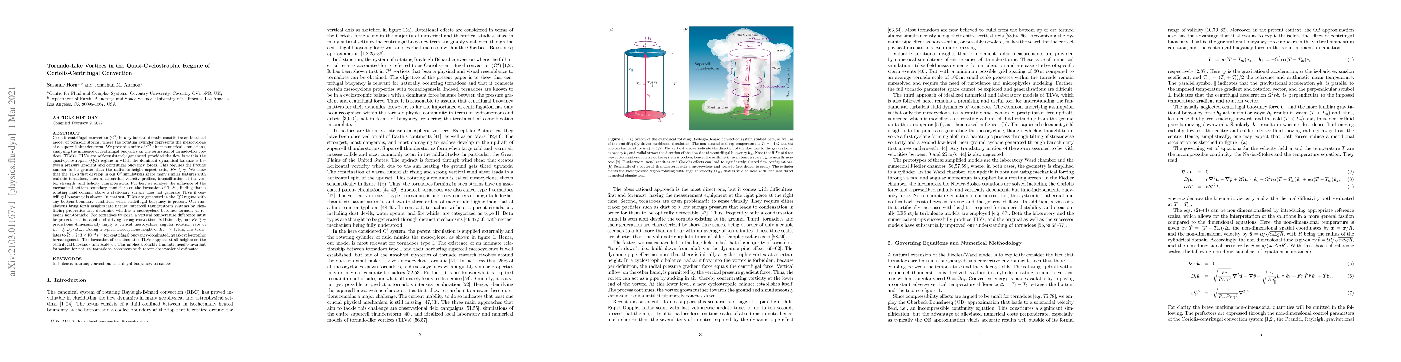 Coriolis-centrifugal convection (C$^3$) in a cylindrical domain constitutes an idealised model of tornadic storms, where the rotating cylinder represents the mesocyclone of a supercell thunderstorm. We present a suite of C$^3$ direct numerical simulations, analysing the influence of centrifugal buoyancy on the formation of tornado-like vortices (TLVs). TLVs are self-consistently generated provided the flow is within the quasi-cyclostrophic (QC) regime. This requires the Froude number to be greater than the radius-to-height aspect ratio, $Fr \gtrsim \gamma$. We show that the TLVs share many features with realistic tornadoes, such as azimuthal velocity profiles, intensification of the vortex strength, and helicity characteristics. Further, we analyse the influence of the mechanical bottom boundary conditions on the formation of TLVs, finding that a rotating fluid column above a stationary surface does not generate TLVs if centrifugal buoyancy is absent. In contrast, TLVs are generated in the QC regime with any bottom boundary conditions when centrifugal buoyancy is present. Our simulations bring forth insights into natural supercell thunderstorm systems by identifying properties that determine whether a mesocyclone becomes tornadic or remains non-tornadic. Our $Fr \gtrsim \gamma$ predictions dimensionally imply a critical mesocyclone angular rotation rate of $\widetilde{\Omega}_{mc} \gtrsim \sqrt{g/H_{mc}}$. Taking a typical mesocyclone height of $H_{mc}\approx 12$ km, this translates to $\widetilde{\Omega}_{mc}\gtrsim 3~\times~10^{-2}$s$^{-1}$ for centrifugal buoyancy-dominated, quasi-cyclostrophic tornadogenesis. The formation of the simulated TLVs happens at all heights on the centrifugal buoyancy time scale $\tau_{cb}$. This implies a roughly 1 minute, height-invariant formation for natural tornadoes, consistent with recent observational estimates.
