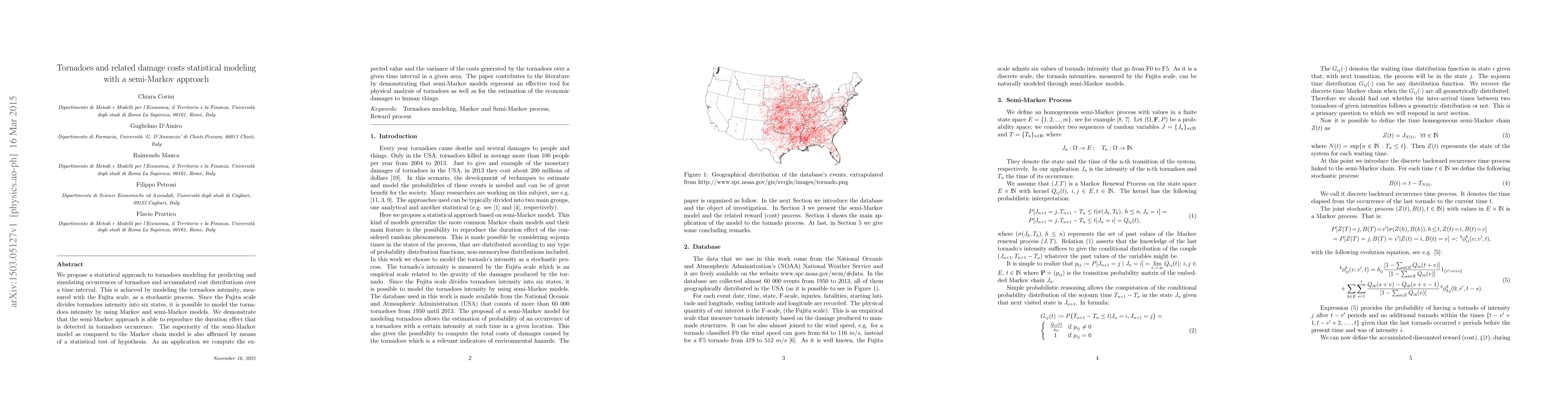 We propose a statistical approach to tornadoes modeling for predicting and simulating occurrences of tornadoes and accumulated cost distributions over a time interval. This is achieved by modeling the tornadoes intensity, measured with the Fujita scale, as a stochastic process. Since the Fujita scale divides tornadoes intensity into six states, it is possible to model the tornadoes intensity by using Markov and semi-Markov models. We demonstrate that the semi-Markov approach is able to reproduce the duration effect that is detected in tornadoes occurrence. The superiority of the semi-Markov model as compared to the Markov chain model is also affirmed by means of a statistical test of hypothesis. As an application we compute the expected value and the variance of the costs generated by the tornadoes over a given time interval in a given area. he paper contributes to the literature by demonstrating that semi-Markov models represent an effective tool for physical analysis of tornadoes as well as for the estimation of the economic damages to human things.