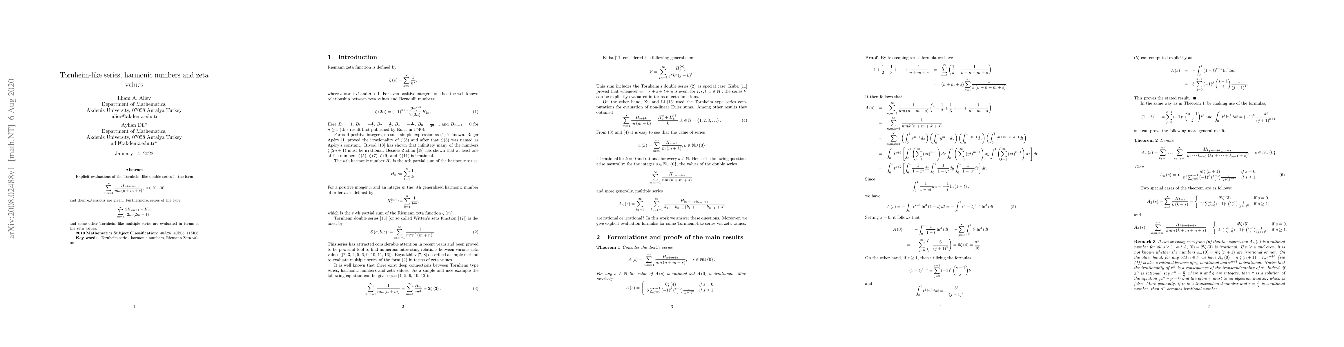 This paper provides explicit evaluations of Tornheim-like double series involving harmonic numbers and zeta values, including the series \[\sum_{n,m=1}^\infty \frac{H_{n+m+s}}{nm\left( n+m+s \right)},\] and evaluates additional series such as \[\sum_{m=1}^\infty \frac{2H_{2m+1}-H_{m}}{2m\left( 2m+1 \right)}\] in terms of zeta values.