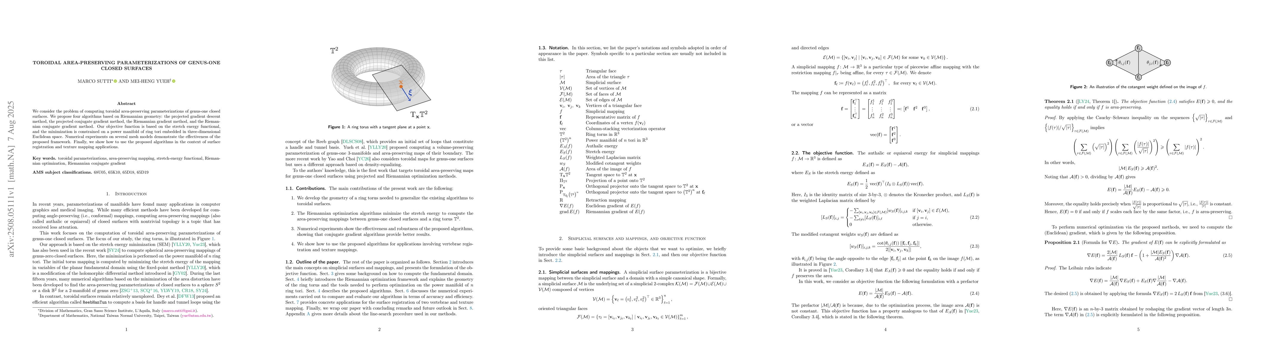We consider the problem of computing toroidal area-preserving parameterizations of genus-one closed surfaces. We propose four algorithms based on Riemannian geometry: the projected gradient descent method, the projected conjugate gradient method, the Riemannian gradient method, and the Riemannian conjugate gradient method. Our objective function is based on the stretch energy functional, and the minimization is constrained on a power manifold of ring tori embedded in three-dimensional Euclidean space. Numerical experiments on several mesh models demonstrate the effectiveness of the proposed framework. Finally, we show how to use the proposed algorithms in the context of surface registration and texture mapping applications.