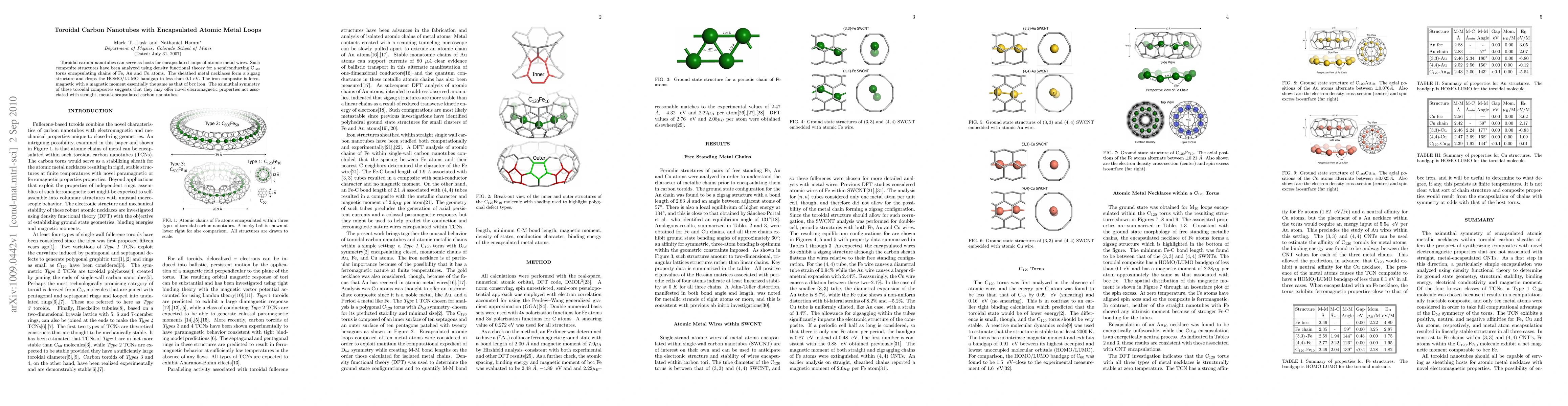 Toroidal carbon nanotubes encapsulating atomic metal loops, analyzed using density functional theory, show reduced HOMO/LUMO bandgaps and unique electromagnetic properties, with the iron composite exhibiting ferromagnetic behavior similar to bcc iron.