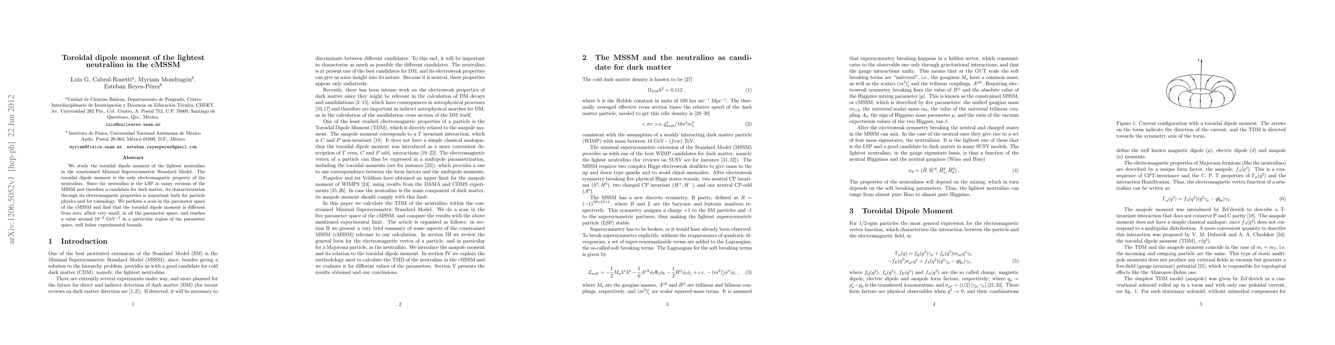 We study the toroidal dipole moment of the lightest neutralino in the constrained Minimal Supersymmetric Standard Model. The toroidal dipole moment is the only electromagnetic property of the neutralino. Since the neutralino is the LSP in many versions of the MSSM and therefore a candidate for dark matter, its characterization through its electromagnetic properties is important both for particle physics and for cosmology. We perform a scan in the parameter space of the cMSSM and find that the toroidal dipole moment is different from zero, albeit very small, in all the parameter space, and reaches a value around $10^{-3} \mathrm{GeV}^{-2}$ in a particular region of the parameter space, well below experimental bounds.