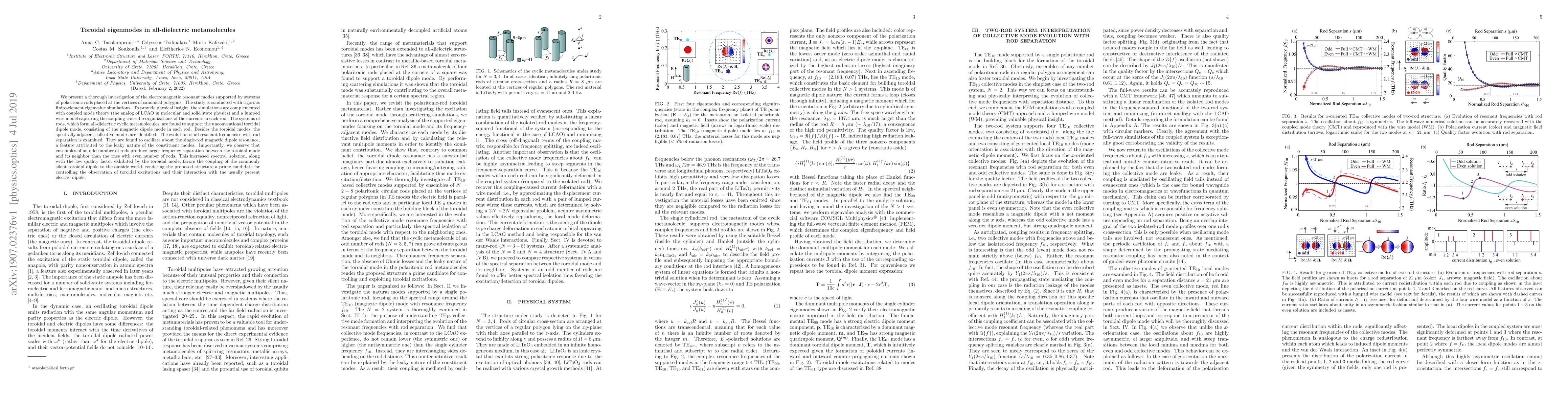 We present a thorough investigation of the electromagnetic resonant modes supported by systems of polaritonic rods placed at the vertices of canonical polygons. The study is conducted with rigorous finite-element eigenvalue simulations. To provide physical insight, the simulations are complemented with coupled mode theory (the analog of LCAO in molecular and solid state physics) and a lumped wire model capturing the coupling-caused reorganizations of the currents in each rod. The systems of rods, which form all-dielectric cyclic metamolecules, are found to support the unconventional toroidal dipole mode, consisting of the magnetic dipole mode in each rod. Besides the toroidal modes, the spectrally adjacent collective modes are identified. The evolution of all resonant frequencies with rod separation is examined. They are found to oscillate about the single-rod magnetic dipole resonance, a feature attributed to the leaky nature of the constituent modes. Importantly, we observe that ensembles of an odd number of rods produce larger frequency separation between the toroidal mode and its neighbor than the ones with even number of rods. This increased spectral isolation, along with the low quality factor exhibited by the toroidal mode, favors the coupling of the commonly silent toroidal dipole to the outside world, rendering the proposed structure a prime candidate for controlling the observation of toroidal excitations and their interaction with the usually present electric dipole