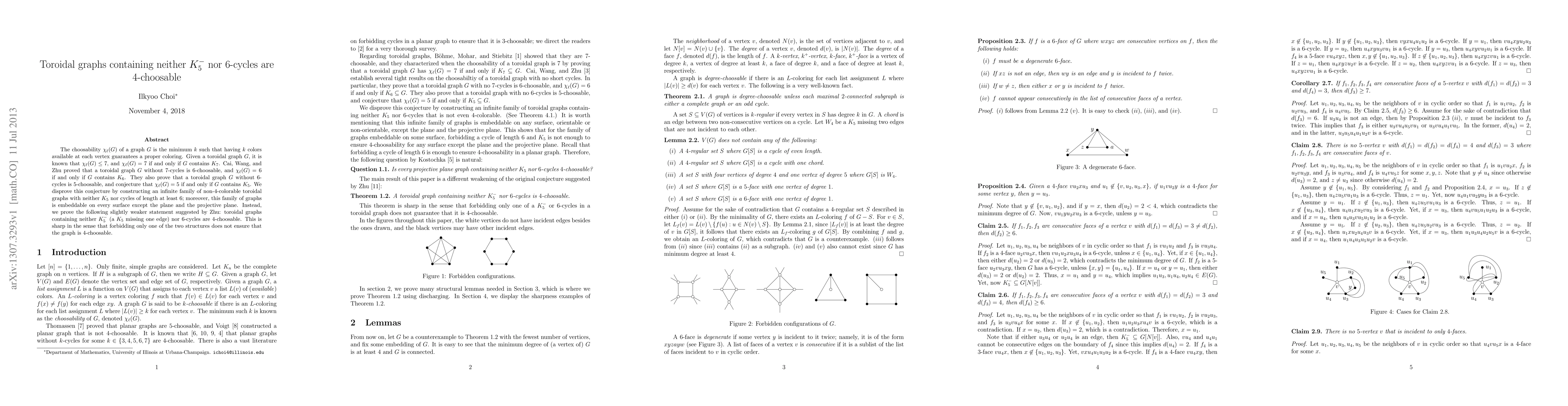 This paper disproves the conjecture that toroidal graphs without $K_5$ or cycles of length at least 6 are 5-choosable, instead proving that toroidal graphs without $K_5^{-}$ or 6-cycles are 4-choosable. It highlights that forbidding either structure alone does not guarantee 4-choosability.