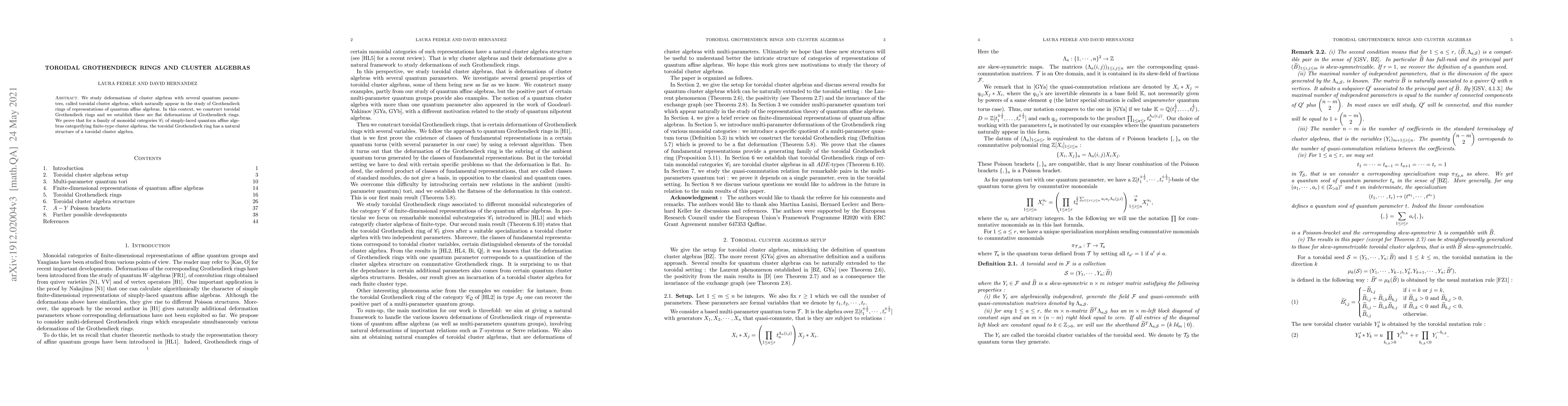 This paper explores toroidal cluster algebras, which arise in the study of Grothendieck rings of quantum affine algebras, and constructs toroidal Grothendieck rings as flat deformations of these rings. It establishes that these rings have a natural structure of toroidal cluster algebras for certain monoidal categories.