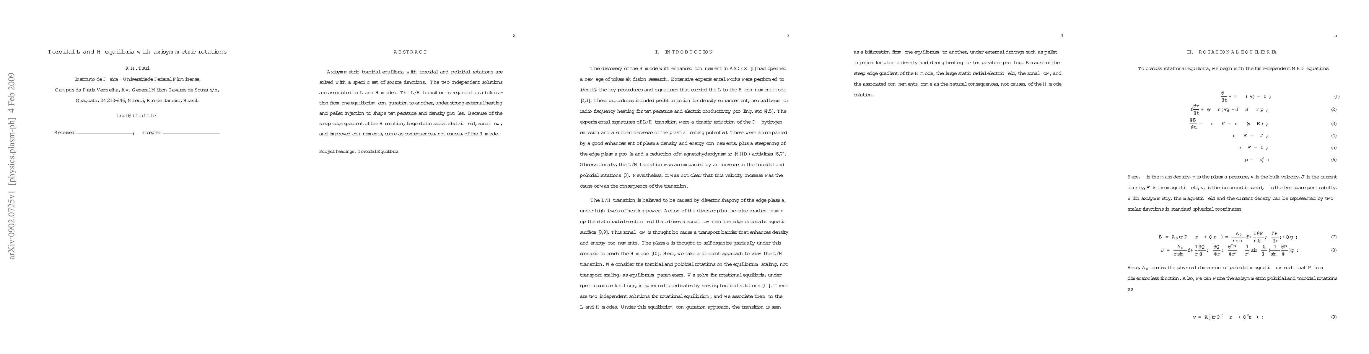 This paper investigates toroidal equilibria in axisymmetric toroidal plasmas with both toroidal and poloidal rotations, identifying L and H mode solutions. The L/H transition is characterized as a bifurcation resulting from strong heating and pellet injection, leading to improved confinement associated with steep edge gradients and large radial electric fields.