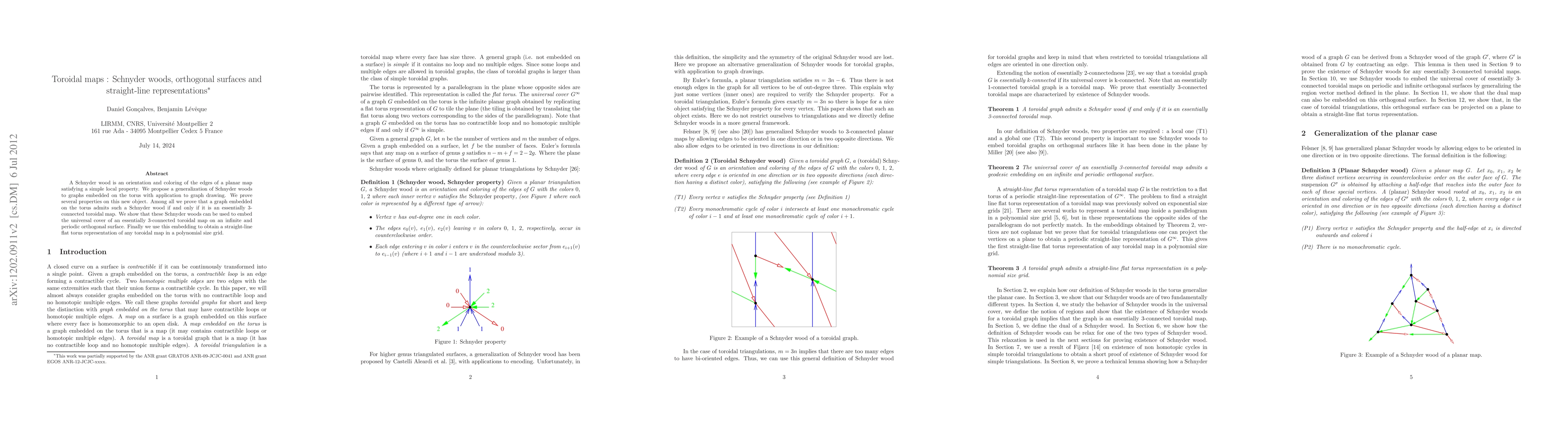 This paper generalizes Schnyder woods to toroidal graphs, proving that such embeddings exist if and only if the graph is essentially 3-connected. It also introduces an infinite periodic orthogonal surface for embedding the universal cover of these toroidal maps and presents a method for obtaining polynomial-size straight-line flat torus representations.