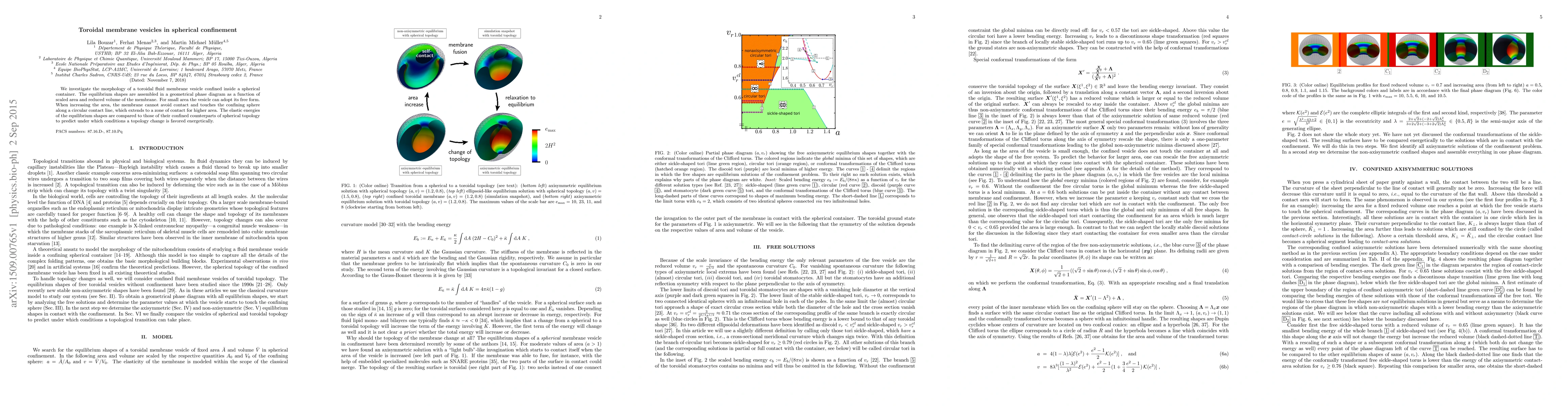 This study examines the equilibrium shapes of toroidal membrane vesicles confined within a spherical container, mapping their morphology in a geometrical phase diagram based on area and volume. The research reveals that as the vesicle's area increases, it transitions from a free form to a state of contact with the sphere, with elastic energies compared to spherical vesicles to determine energetically favorable topology changes.