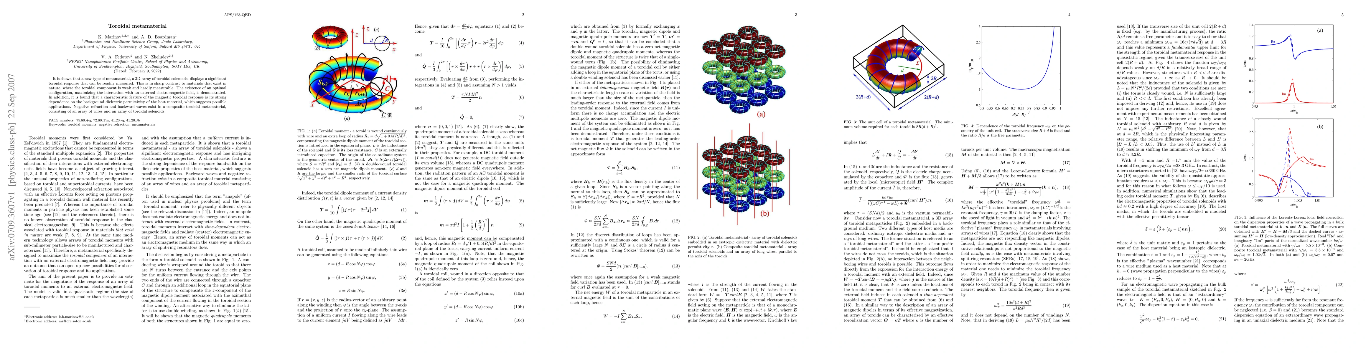 It is shown that a new type of metamaterial, a 3D-array of toroidal solenoids, displays a significant toroidal response that can be readily measured. This is in sharp contrast to materials that exist in nature, where the toroidal component is weak and hardly measurable. The existence of an optimal configuration, maximizing the interaction with an external electromagnetic field, is demonstrated. In addition, it is found that a characteristic feature of the magnetic toroidal response is its strong dependence on the background dielectric permittivity of the host material, which suggests possible applications. Negative refraction and backward waves exist in a composite toroidal metamaterial, consisting of an array of wires and an array of toroidal solenoids.