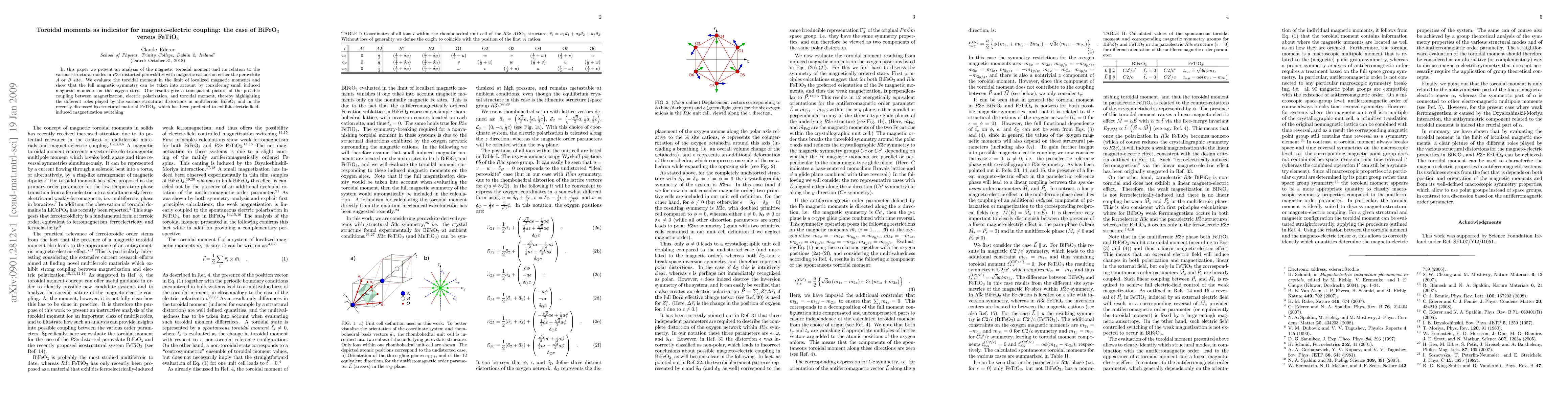 In this paper we present an analysis of the magnetic toroidal moment and its relation to the various structural modes in R3c-distorted perovskites with magnetic cations on either the perovskite A or B site. We evaluate the toroidal moment in the limit of localized magnetic moments and show that the full magnetic symmetry can be taken into account by considering small induced magnetic moments on the oxygen sites. Our results give a transparent picture of the possible coupling between magnetization, electric polarization, and toroidal moment, thereby highlighting the different roles played by the various structural distortions in multiferroic BiFeO_3 and in the recently discussed isostructural material FeTiO_3, which has been predicted to exhibit electric field-induced magnetization switching.