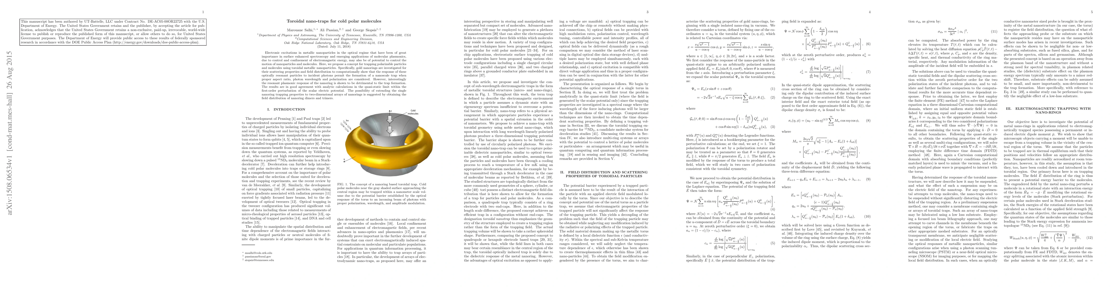 Researchers propose a concept for trapping polar molecules using toroidal metallic nanoparticles, specifically gold nanorings, but find that resonant plasmonic response can hinder trap formation. The study suggests the possibility of extending the single-nanoring trapping properties to two-dimensional arrays.