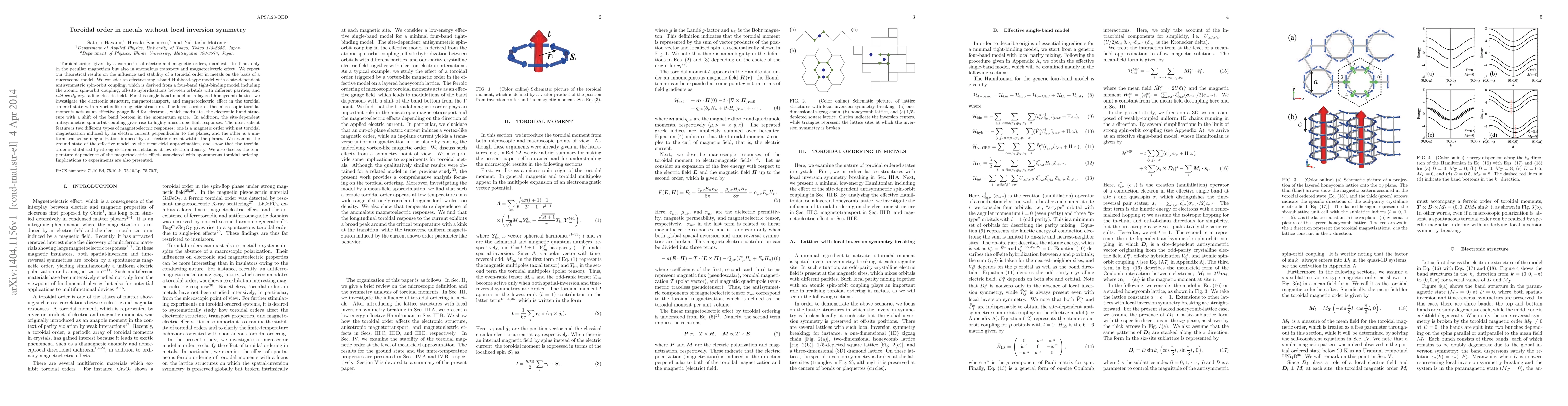 Toroidal order, given by a composite of electric and magnetic orders, manifests itself not only in the peculiar magnetism but also in anomalous transport and magnetoelectric effect. We report our theoretical results on the influence and stability of a toroidal order in metals on the basis of a microscopic model. We consider an effective single-band Hubbard-type model with a site-dependent antisymmetric spin-orbit coupling, which is derived from a four-band tight-binding model including the atomic spin-orbit coupling, off-site hybridizations between orbitals with different parities, and odd-parity crystalline electric field. For this single-band model on a layered honeycomb lattice, we investigate the electronic structure, magnetotransport, and magnetoelectric effect in the toroidal ordered state with a vortex-like magnetic structure. The ferroic order of the microscopic toroidal moments acts as an effective gauge field for electrons, which modulates the electronic band structure with a shift of the band bottom in the momentum space. In addition, the site-dependent antisymmetric spin-orbit coupling gives rise to highly anisotropic Hall responses. The most salient feature is two different types of magnetoelectric responses: one is a magnetic order with net toroidal magnetization induced by an electric current perpendicular to the planes, and the other is a uniform transverse magnetization induced by an electric current within the planes. We examine the ground state of the effective model by the mean-field approximation, and show that the toroidal order is stabilized by strong electron correlations at low electron density. We also discuss the temperature dependence of the magnetoelectric effects associated with spontaneous toroidal ordering. Implications to experiments are also presented.