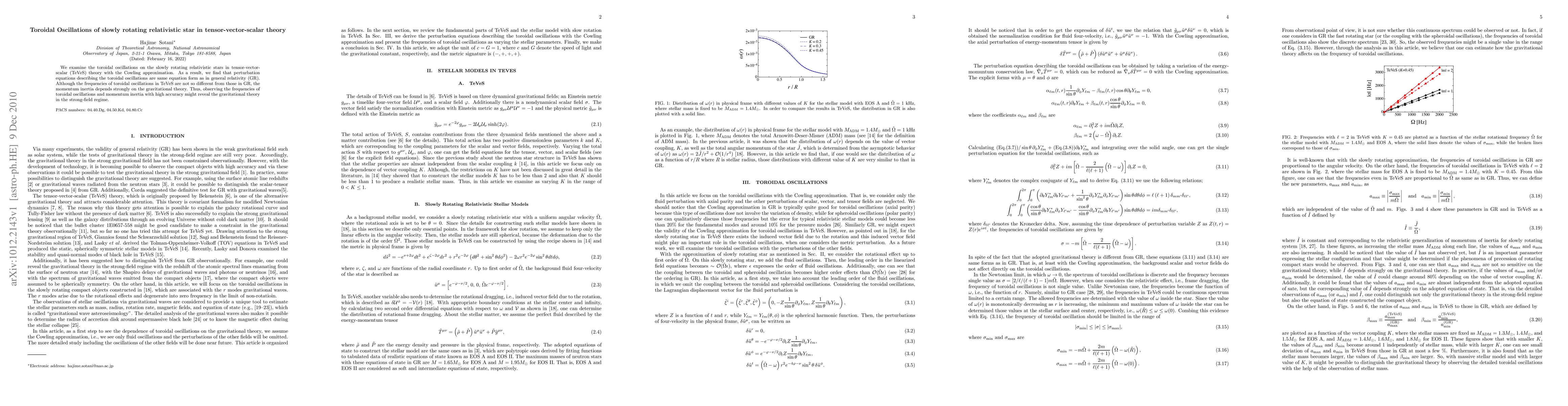 We examine the toroidal oscillations on the slowly rotating relativistic stars in tensor-vector-scalar (TeVeS) theory with the Cowling approximation. As a result, we find that perturbation equations describing the toroidal oscillations are same equation form as in general relativity (GR). Although the frequencies of toroidal oscillations in TeVeS are not so different from those in GR, the momentum inertia depends strongly on the gravitational theory. Thus, observing the frequencies of toroidal oscillations and momentum inertia with high accuracy might reveal the gravitational theory in the strong-field regime.
