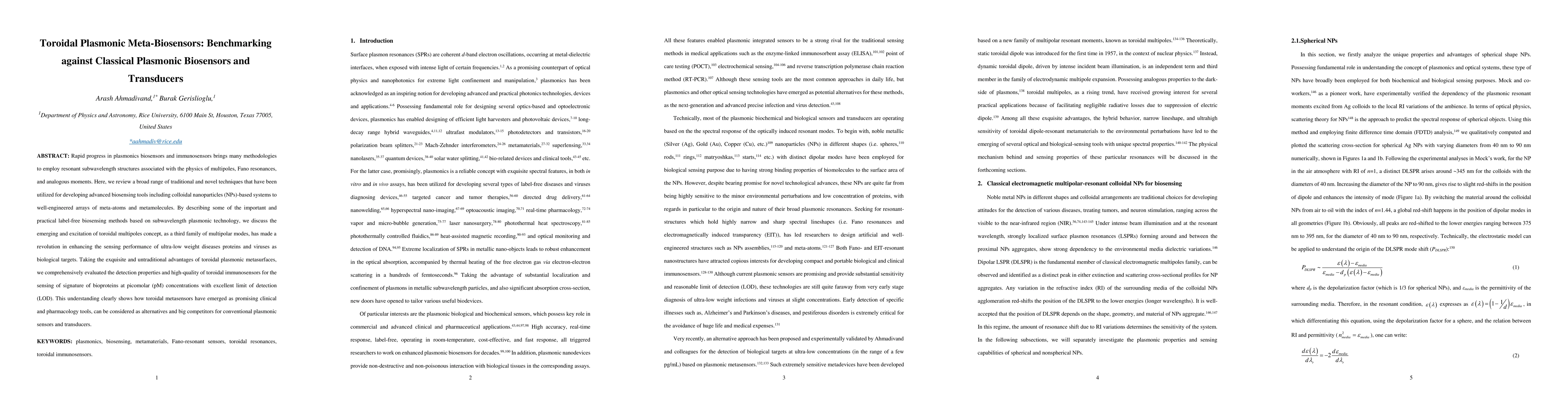 This paper reviews advanced biosensing techniques, highlighting the emergence of toroidal plasmonic meta-biosensors that outperform traditional plasmonic sensors through enhanced detection of ultra-low weight biomolecules at picomolar concentrations. Toroidal metasensors present a novel approach with superior sensitivity and limit of detection, positioning them as strong competitors to conventional biosensors.