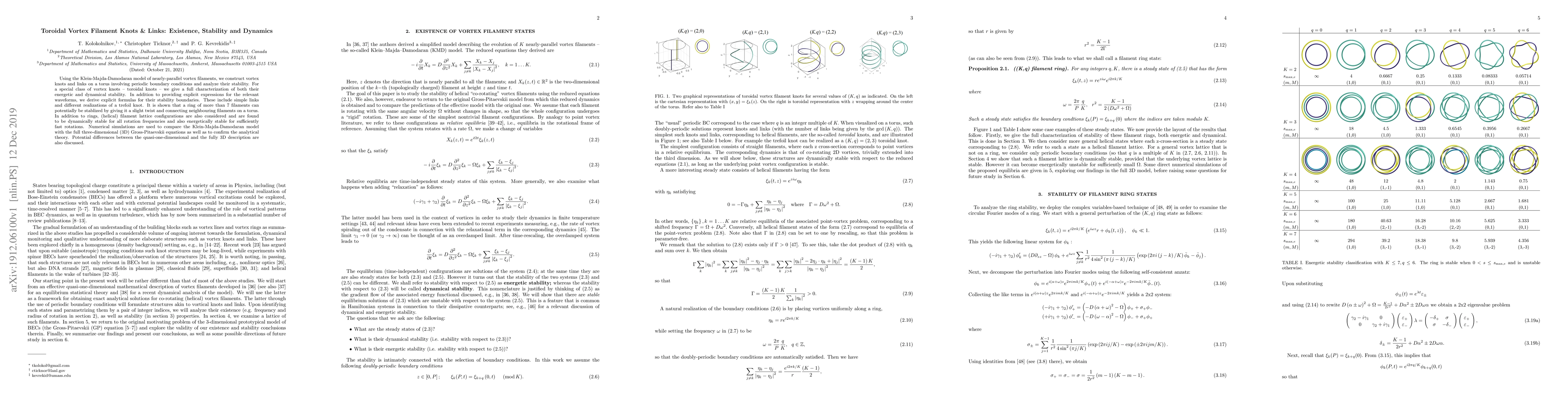 This paper investigates the existence, stability, and dynamics of toroidal vortex filament knots and links using the Klein-Majda-Damodaran model. It characterizes the energetic and dynamical stability of toroidal knots and derives stability boundaries, showing that rings of more than 7 filaments can be stabilized with slight twists and that helical filament lattice configurations maintain stability under various conditions.