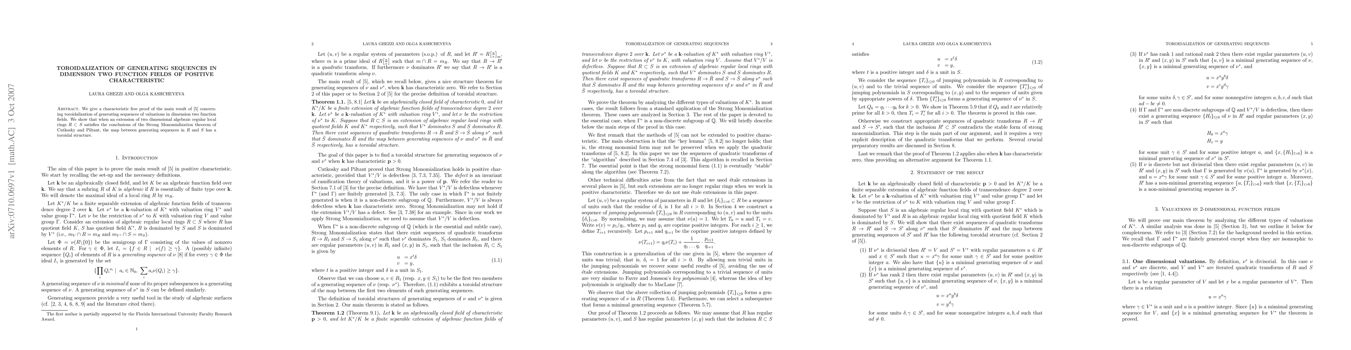 This paper provides a characteristic-free proof of toroidalization of generating sequences in dimension two function fields, showing that under certain conditions on an extension of algebraic local rings, the map between generating sequences retains a toroidal structure.