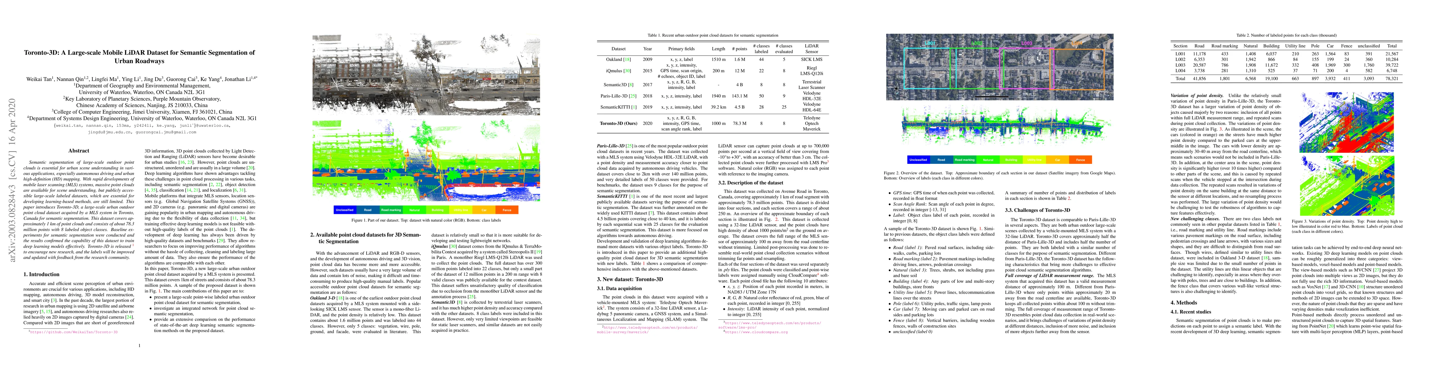 Toronto-3D is a large-scale, urban outdoor LiDAR dataset for semantic segmentation, consisting of 78.3 million points covering 1 km in Toronto. It aims to facilitate research in autonomous driving and urban HD mapping by providing a publicly accessible labeled dataset for training deep learning models.