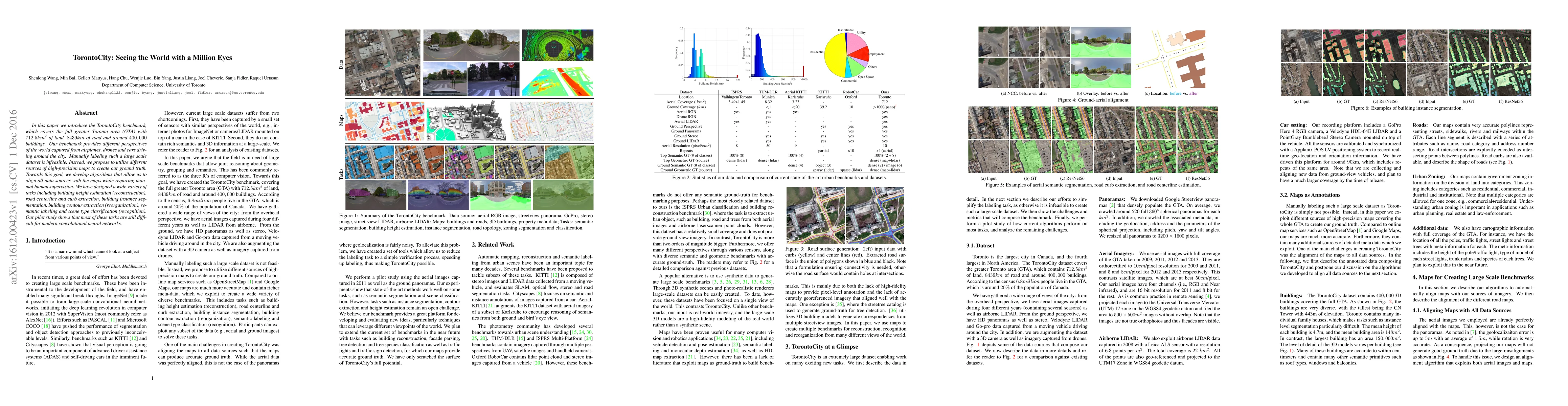 Researchers introduce the TorontoCity benchmark to study urban data with a million eyes, proposing algorithms for ground truth creation and challenging modern convolutional neural networks with tasks like building height estimation and scene type classification.