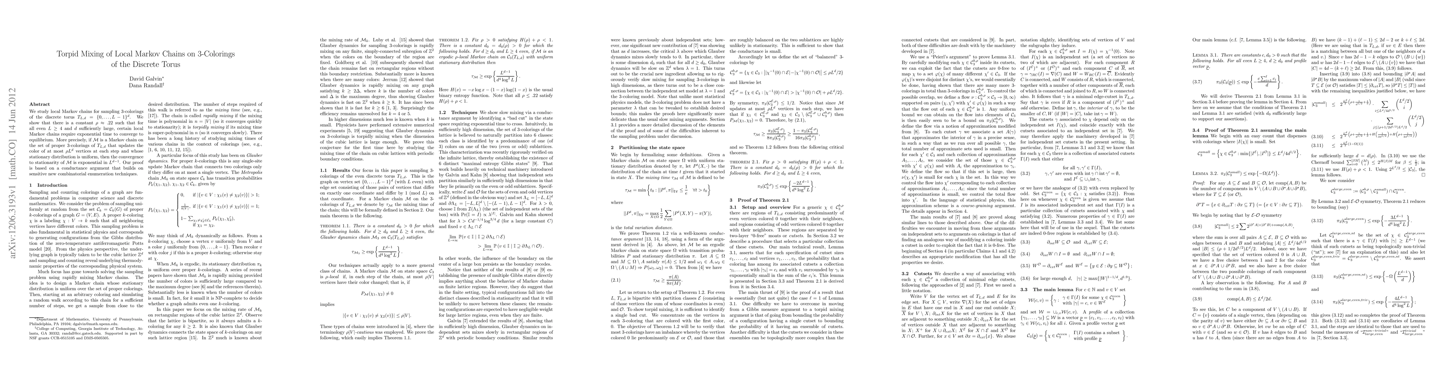 We study local Markov chains for sampling 3-colorings of the discrete torus $T_{L,d}={0,..., L-1}^d$. We show that there is a constant $\rho \approx .22$ such that for all even $L \geq 4$ and $d$ sufficiently large, certain local Markov chains require exponential time to converge to equilibrium. More precisely, if $\cM$ is a Markov chain on the set of proper 3-colorings of $T_{L,d}$ that updates the color of at most $\rho L^d$ vertices at each step and whose stationary distribution is uniform, then the convergence to stationarity of $\cM$ is exponential in $L^{d-1}$. Our proof is based on a conductance argument that builds on sensitive new combinatorial enumeration techniques.