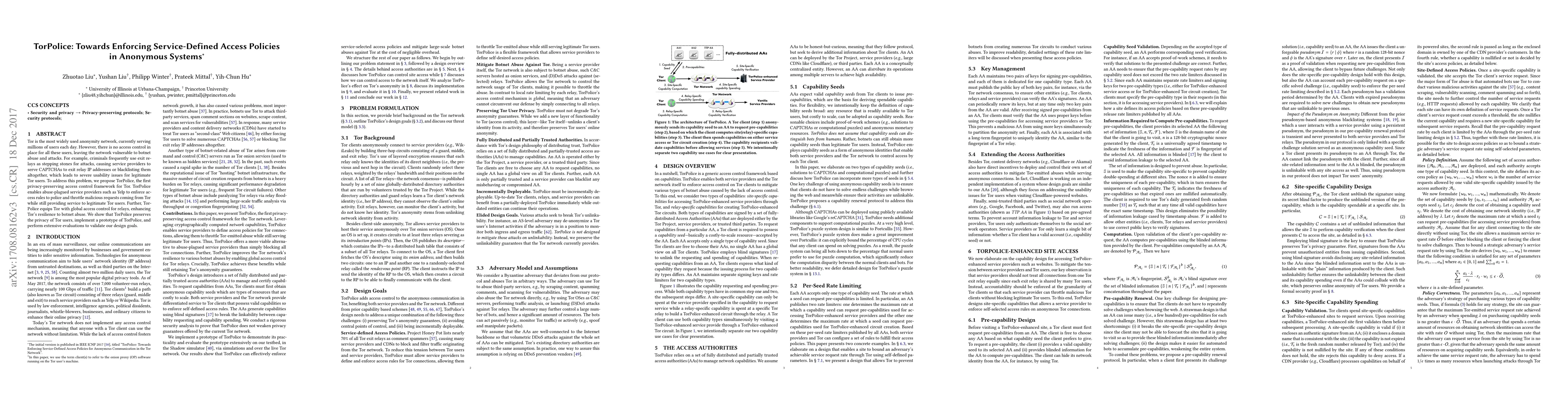 Tor is the most widely used anonymity network, currently serving millions of users each day. However, there is no access control in place for all these users, leaving the network vulnerable to botnet abuse and attacks. For example, criminals frequently use exit relays as stepping stones for attacks, causing service providers to serve CAPTCHAs to exit relay IP addresses or blacklisting them altogether, which leads to severe usability issues for legitimate Tor users. To address this problem, we propose TorPolice, the first privacy-preserving access control framework for Tor. TorPolice enables abuse-plagued service providers such as Yelp to enforce access rules to police and throttle malicious requests coming from Tor while still providing service to legitimate Tor users. Further, TorPolice equips Tor with global access control for relays, enhancing Tor's resilience to botnet abuse. We show that TorPolice preserves the privacy of Tor users, implement a prototype of TorPolice, and perform extensive evaluations to validate our design goals.