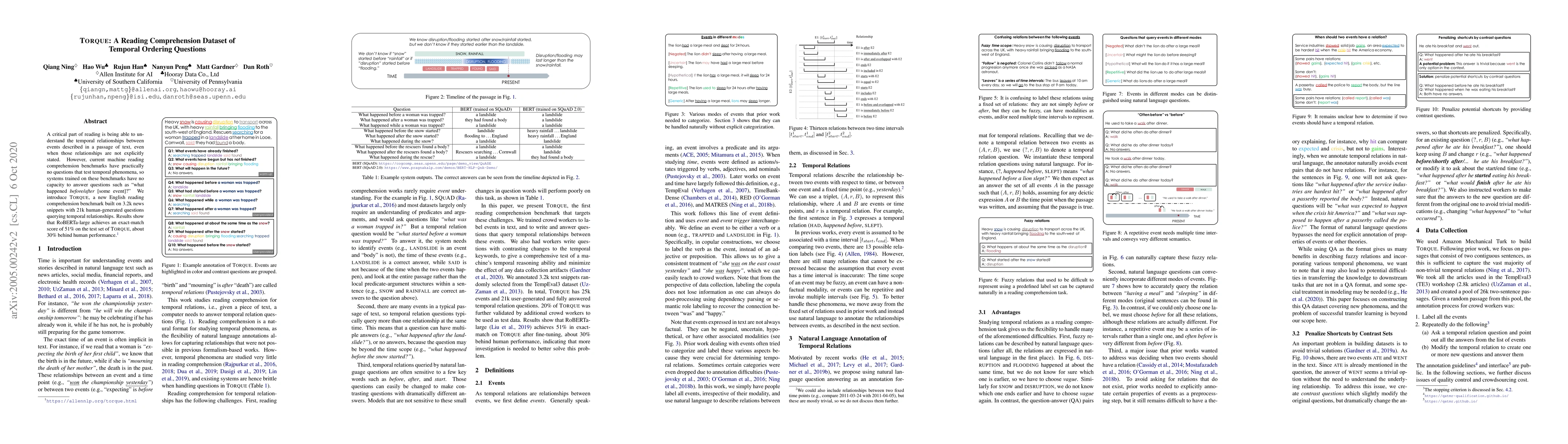 TORQUE is a new reading comprehension dataset designed to test understanding of temporal relationships in text, featuring 21k questions from 3.2k news snippets. RoBERTa-large achieves 51% exact-match accuracy on the test set, falling 30% behind human performance.