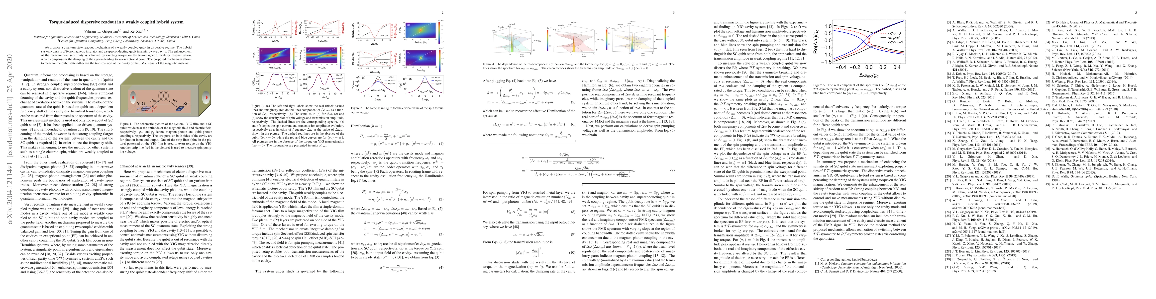 This paper proposes a quantum state readout mechanism for a weakly coupled qubit in a dispersive regime using a hybrid system of a ferromagnetic insulator and a superconducting qubit. The measurement sensitivity is enhanced by applying torque to the ferromagnetic insulator, achieving an exceptional point that compensates for system damping.