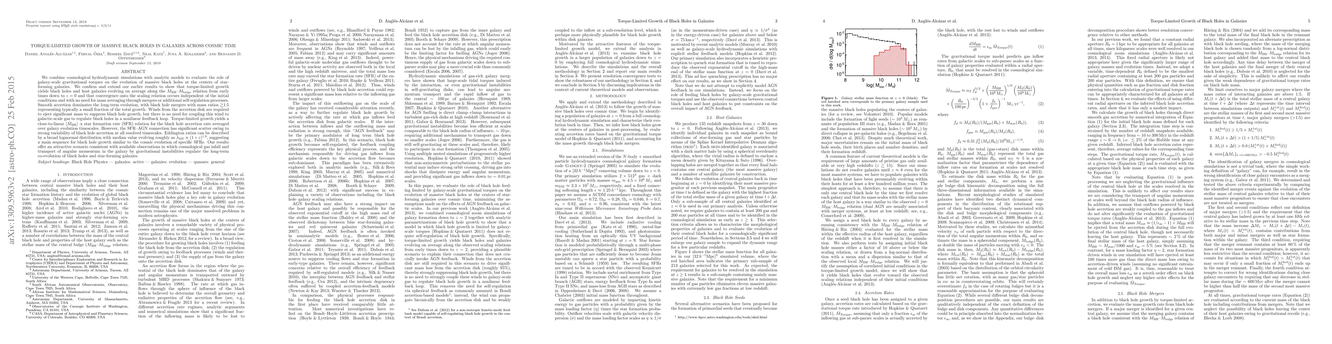 We combine cosmological hydrodynamic simulations with analytic models to evaluate the role of galaxy-scale gravitational torques on the evolution of massive black holes at the centers of star-forming galaxies. We confirm and extend our earlier results to show that torque-limited growth yields black holes and host galaxies evolving on average along the Mbh-Mbulge relation from early times down to z = 0 and that convergence onto the scaling relation occurs independent of the initial conditions and with no need for mass averaging through mergers or additional self-regulation processes. Smooth accretion dominates the long-term evolution, with black hole mergers with mass ratios >1:5 representing typically a small fraction of the total growth. Winds from the accretion disk are required to eject significant mass to suppress black hole growth, but there is no need for coupling this wind to galactic-scale gas to regulate black holes in a non-linear feedback loop. Torque-limited growth yields a close-to-linear relation for the star formation rate and the black hole accretion rate averaged over galaxy evolution time scales. However, the SFR-AGN connection has significant scatter owing to strong variability of black hole accretion at all resolved time scales. Eddington ratios can be described by a broad lognormal distribution with median value evolving roughly as (1 + z)^1.9, suggesting a main sequence for black hole growth similar to the cosmic evolution of specific SFRs. Our results offer an attractive scenario consistent with available observations in which cosmological gas infall and transport of angular momentum in the galaxy by gravitational instabilities regulate the long-term co-evolution of black holes and star-forming galaxies.