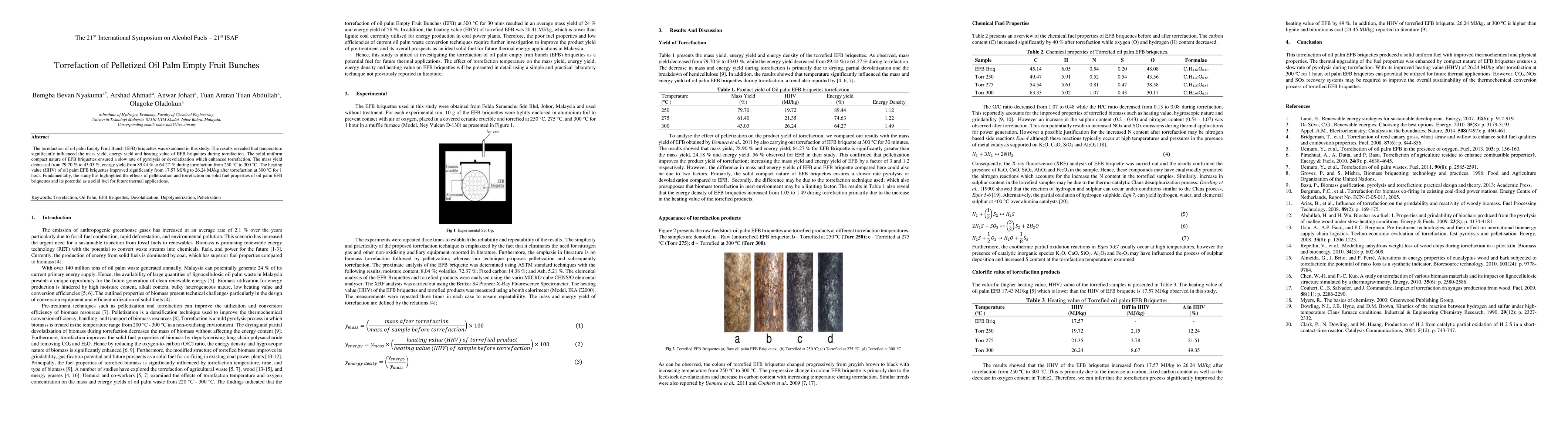 The torrefaction of oil palm Empty Fruit Bunch (EFB) briquettes was examined in this study. The results indicate that temperature significantly influenced the mass yield, energy yield and heating value of oil palm empty fruit bunch (OPEFB) briquettes during torrefaction. The solid uniform compact nature of EFB briquettes ensured a slow rate of pyrolysis or devolatization which enhanced torrefaction. The mass yield decreased from 79.70 % to 43.03 %, energy yield from 89.44 % to 64.27 % during torrefaction from 250 {\deg}C to 300 {\deg}C. The heating value (HHV) of OPEFB briquettes improved significantly from 17.57 MJ/kg to 26.24 MJ/kg after torrefaction at 300 {\deg}C for 1 hour. Fundamentally, the study has highlighted the effects of pelletization and torrefaction on solid fuel properties of oil palm EFB briquettes and its potential as a solid fuel for future thermal applications.