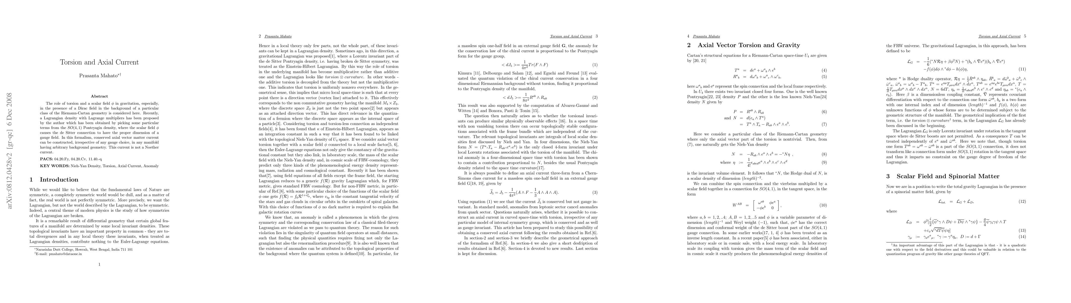 This paper explores torsion and a scalar field $\phi$ in the context of gravitation within Riemann-Cartan geometry, proposing a Lagrangian density derived from the SO(4,1) Pontryagin density. It constructs a conserved axial vector matter current independent of gauge choice, applicable to manifolds with arbitrary background geometry.