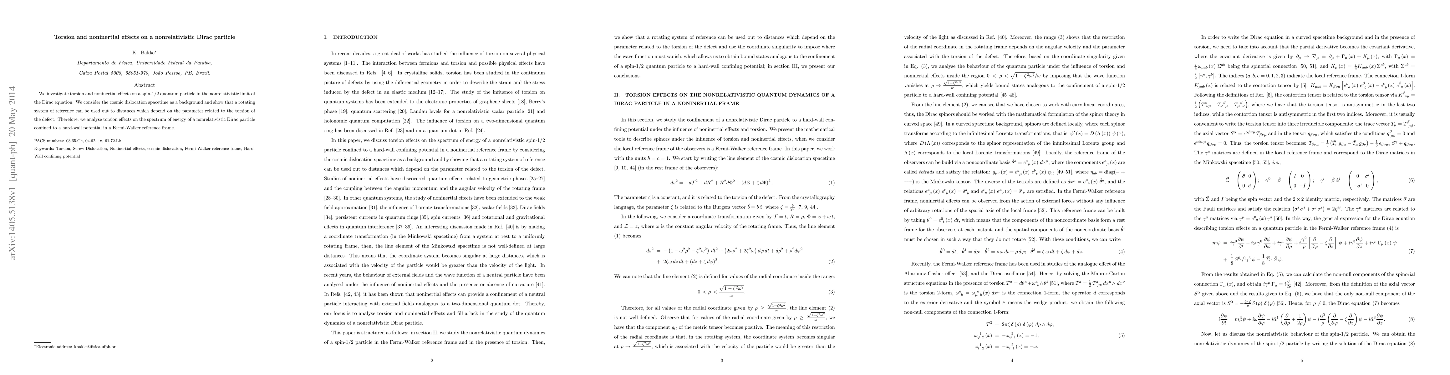 We investigate torsion and noninertial effects on a spin-$1/2$ quantum particle in the nonrelativistic limit of the Dirac equation. We consider the cosmic dislocation spacetime as a background and show that a rotating system of reference can be used out to distances which depend on the parameter related to the torsion of the defect. Therefore, we analyse torsion effects on the spectrum of energy of a nonrelativistic Dirac particle confined to a hard-wall potential in a Fermi-Walker reference frame.