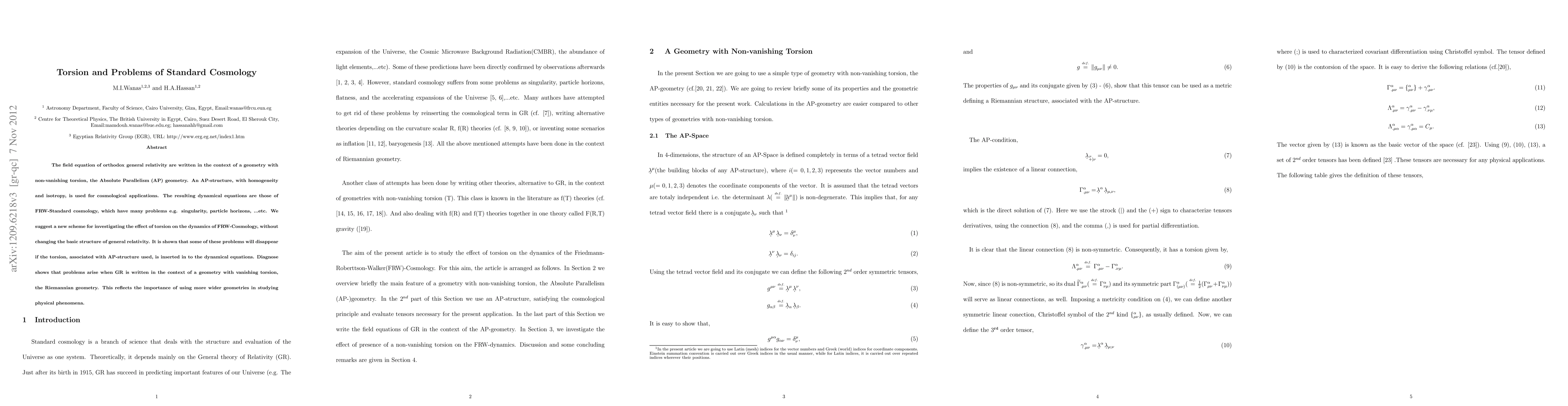 The field equation of orthodox general relativity are written in the context of a geometry with non-vanishing torsion, the Absolute Parallelism (AP) geometry. An AP-structure, with homogeneity and isotropy, is used for cosmological applications. The resulting dynamical equations are those of FRW-Standard cosmology, which have many problems e.g. singularity, particle horizons, ...etc. We suggest a new scheme for investigating the effect of torsion on the dynamics of FRW-Cosmology, without changing the basic structure of general relativity. It is shown that some of these problems will disappear if the torsion, associated with AP-structure used, is inserted in to the dynamical equations. Diagnose shows that problems arise when GR is written in the context of a geometry with vanishing torsion, the Riemannian geometry. This reflects the importance of using more wider geometries in studying physical phenomena.