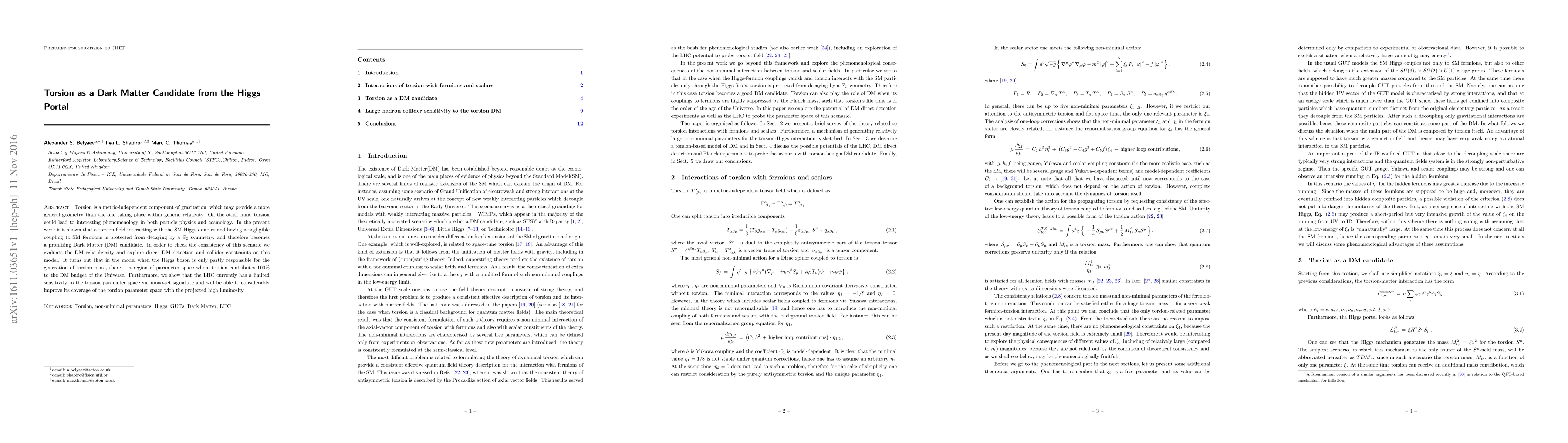 This paper proposes torsion, a metric-independent component of gravitation, as a viable dark matter candidate through the Higgs portal. It demonstrates that torsion, interacting with the SM Higgs but not significantly with fermions, can evade decay due to a $Z_2$ symmetry, thus fulfilling dark matter criteria. The study finds a parameter space where torsion could account entirely for the universe's dark matter, with future LHC upgrades expected to enhance torsion detection.