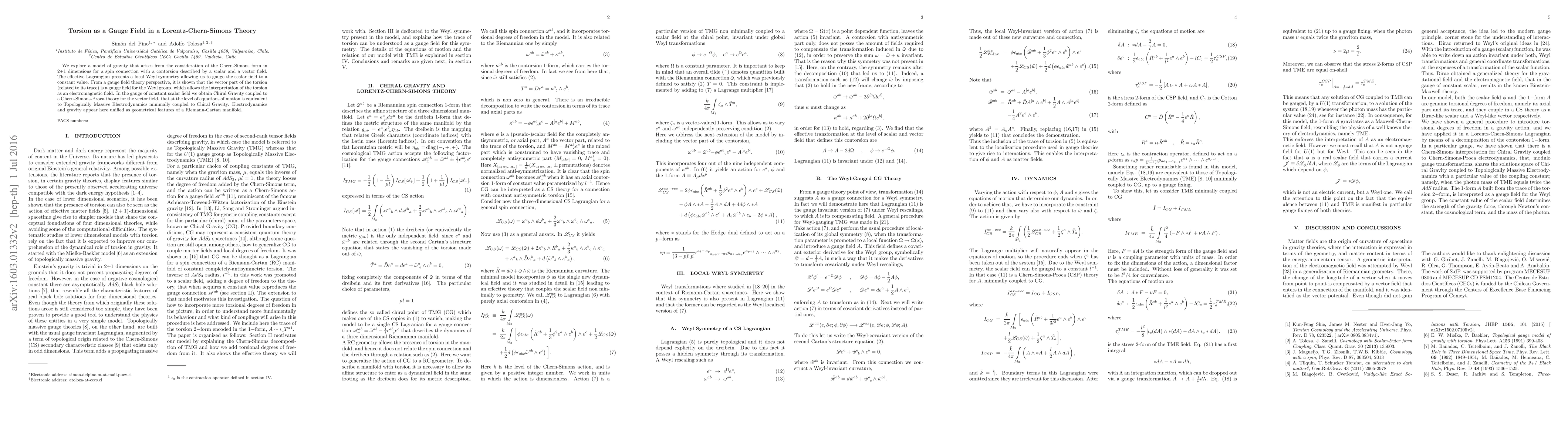 This paper investigates a gravity model in 2+1 dimensions where torsion is treated as a gauge field in a Lorentz-Chern-Simons theory, showing that the vector part of torsion acts as an electromagnetic field for the Weyl group, leading to a unified description of electrodynamics and gravity.