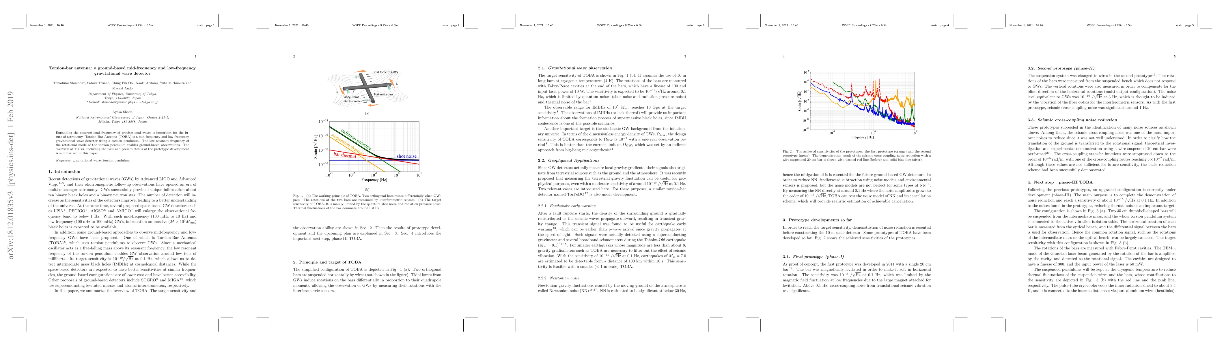 This paper discusses the Torsion-Bar Antenna (TOBA), a ground-based detector for mid-frequency and low-frequency gravitational waves, utilizing a torsion pendulum. The paper reviews the current status and development of TOBA's prototype, highlighting its potential for expanding gravitational wave observations.