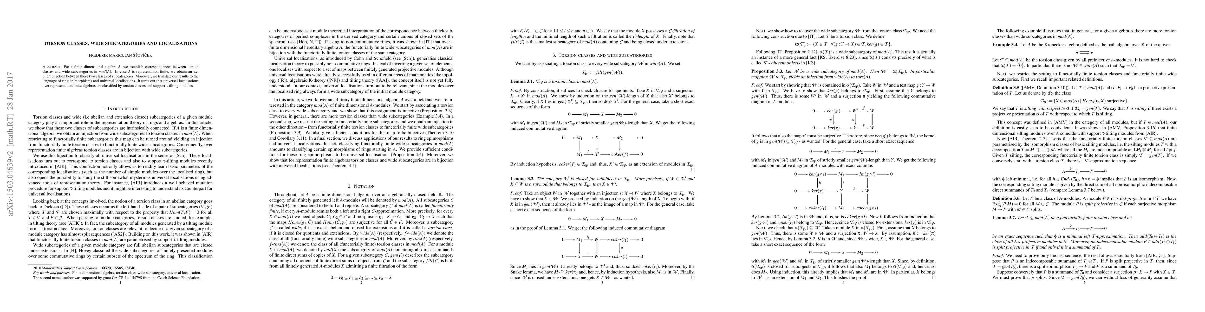 This paper establishes a correspondence between torsion classes and wide subcategories in the module category of a finite dimensional algebra $A$. For representation finite algebras, it provides an explicit bijection between these subcategories and shows that universal localisations are classified by torsion classes and $\tau$-tilting modules.