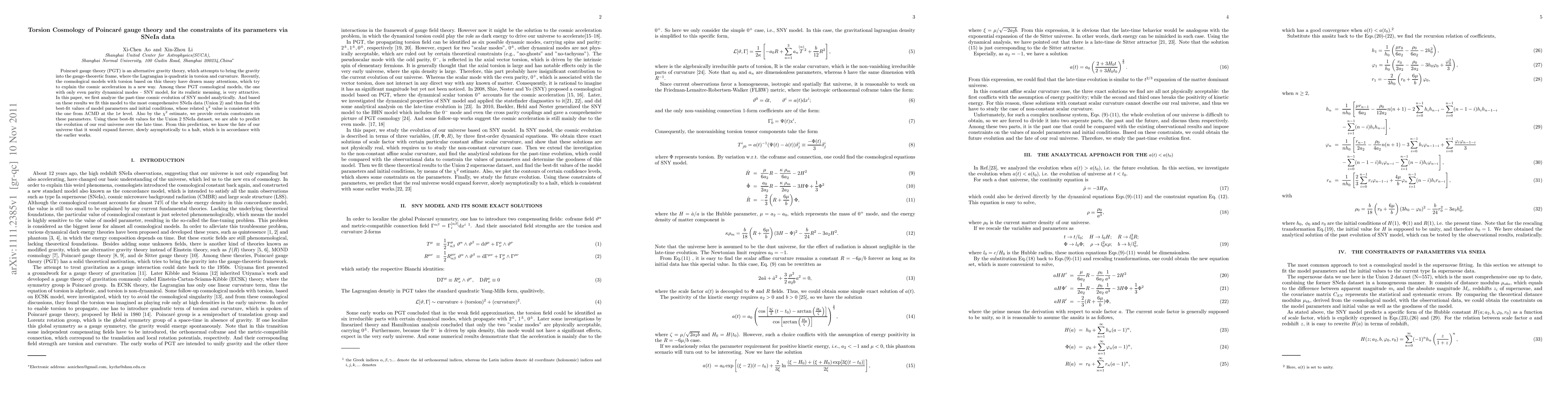 Poincar\`e gauge theory (PGT) is an alternative gravity theory, which attempts to bring the gravity into the gauge-theoretic frame, where the Lagrangian is quadratic in torsion and curvature. Recently, the cosmological models with torsion based on this theory have drawn many attentions, which try to explain the cosmic acceleration in a new way. Among these PGT cosmological models, the one with only even parity dynamical modes -- SNY model, for its realistic meaning, is very attractive. In this paper, we first analyze the past-time cosmic evolution of SNY model analytically. And based on these results we fit this model to the most comprehensive SNeIa data (Union 2) and thus find the best-fit values of model parameters and initial conditions, whose related $\chi^{2}$ value is consistent with the one from $\Lambda$CMD at the 1$\sigma$ level. Also by the $\chi^{2}$ estimate, we provide certain constraints on these parameters. Using these best-fit values for the Union 2 SNeIa dataset, we are able to predict the evolution of our real universe over the late time. From this prediction, we know the fate of our universe that it would expand forever, slowly asymptotically to a halt, which is in accordance with the earlier works.