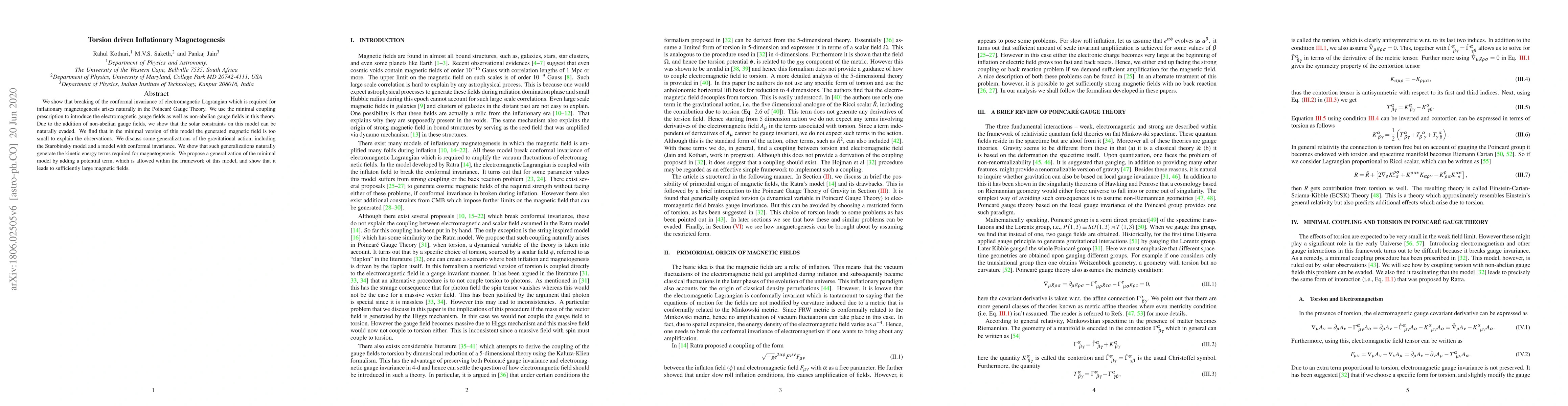 This paper explores inflationary magnetogenesis driven by torsion in Poincaré Gauge Theory, demonstrating how conformal invariance breaking naturally occurs. It proposes a model that evades solar constraints and suggests that generalizations, including the Starobinsky model, can generate the necessary kinetic energy for magnetogenesis, with a potential term addition leading to sufficiently large magnetic fields.