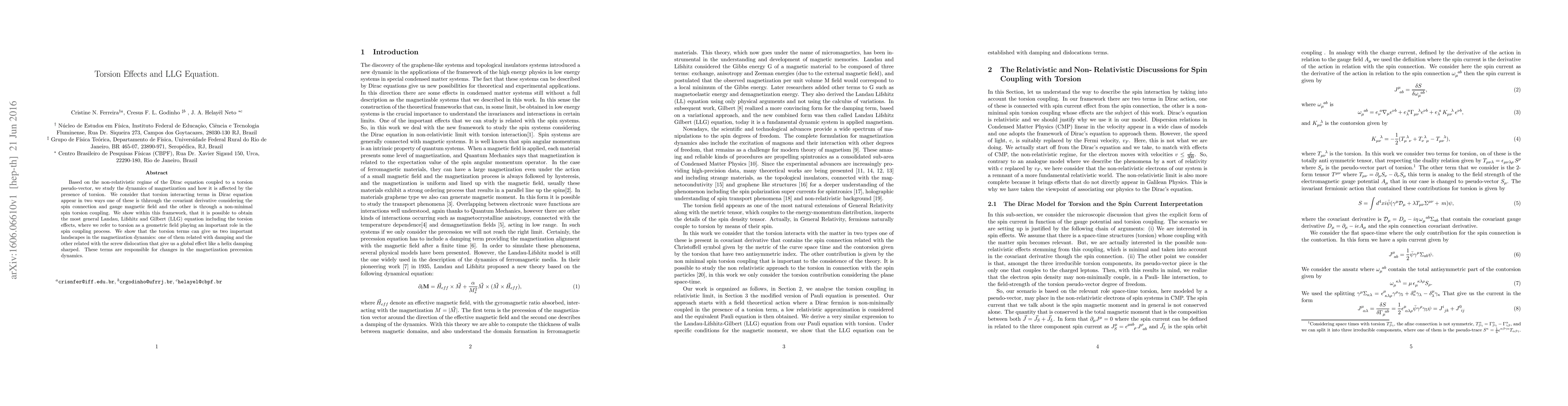 Based on the non-relativistic regime of the Dirac equation coupled to a torsion pseudo-vector, we study the dynamics of magnetization and how it is affected by the presence of torsion. We consider that torsion interacting terms in Dirac equation appear in two ways one of these is thhrough the covariant derivative considering the spin connection and gauge magnetic field and the other is through a non-minimal spin torsion coupling. We show within this framework, that it is possible to obtain the most general Landau, Lifshitz and Gilbert (LLG) equation including the torsion effects, where we refer to torsion as a geometric field playing an important role in the spin coupling process. We show that the torsion terms can give us two important landscapes in the magnetization dynamics: one of them related with damping and the other related with the screw dislocation that give us a global effect like a helix damping sharped. These terms are responsible for changes in the magnetization precession dynamics.