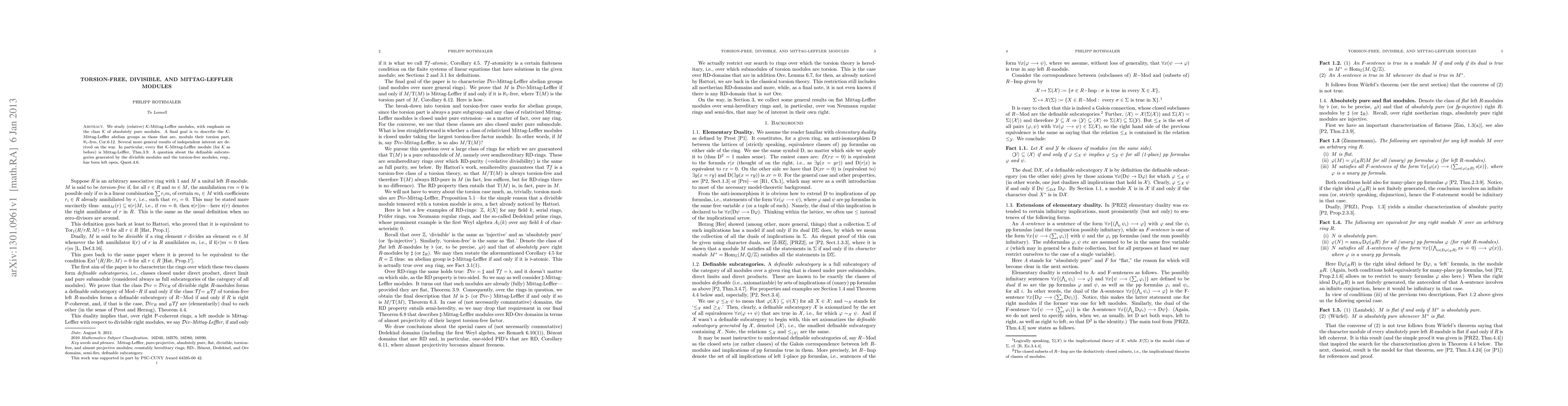 We study (relative) K-Mittag-Leffler modules, with emphasis on the class K of absolutely pure modules. A final goal is to describe the K-Mittag-Leffler abelian groups as those that are, modulo their torsion part, aleph_1-free, Cor.6.12. Several more general results of independent interest are derived on the way. In particular, every flat K-Mittag-Leffler module (for K as before) is Mittag-Leffler, Thm.3.9. A question about the definable subcategories generated by the divisible modules and the torsion-free modules, resp., has been left open, Quest.4.6.