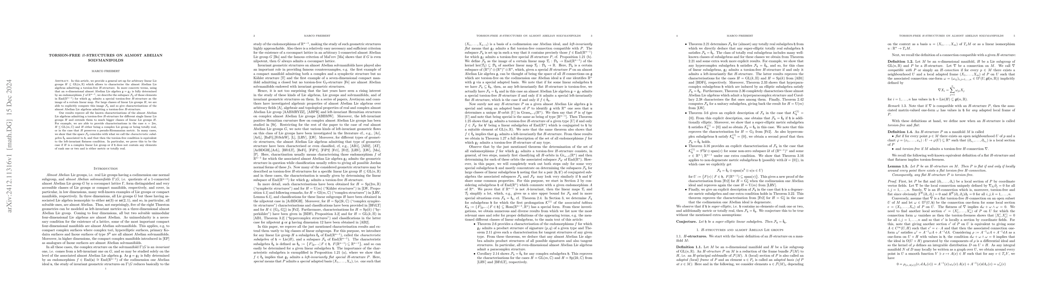 This paper characterizes almost Abelian Lie algebras admitting torsion-free $H$-structures for arbitrary linear Lie groups $H\leq \mathrm{GL}(n,\mathbb{R})$. It identifies the subspace $\mathcal{F}_{\mathfrak{h}}$ of endomorphisms enabling such structures and extends known results to broader classes of $H$, proving equivalences between torsion-free conditions and left-invariant flatness.